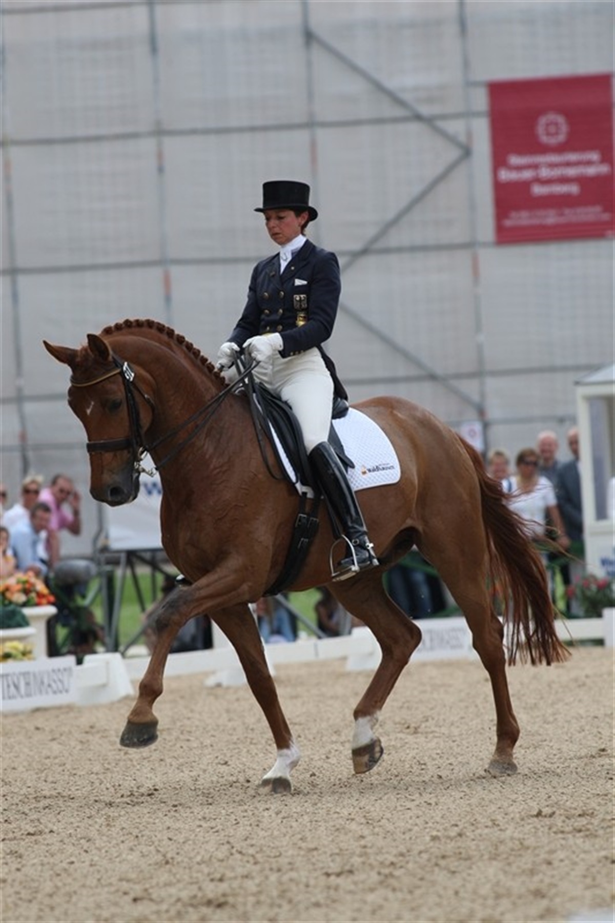 Dressurrytterne i det tyske mesterskab skabte spænding om resultatet allerede i Grand Prix-klassen, som er blevet afviklet her til eftermiddag. Den 38-årige Anabel Balkehol, datter af den tidligere landsholdsrytter Klaus Balkenhol, sejrede i Grand Prix-klassen med Dablino med 74,979% foran Isabell Werth og Warum Nicht, der opnåede 74,426. Hubertus Schmidt og Donelly fulgte efter med 72,894% Fokus samler sig naturligt om det tyske mesterskab, for i lighed med andre nationer, skal tyskerne nu også have sammensat et konkurrencedygtigt landshold til WEG i Kentucky. Anabel Balkenhold har endnu ikke en mesterskabsmedalje, og hvorvidt dagens sejr holder til søndag er naturligvis uvist. Forud venter Grand Prix Special og det hele afgøres i Grand Prix kür søndag. Den 47-årige landsholdsrytter Monica Theodorescu måtte sluge en bitter pille i dagens konkurrence, idet hendes tophest Whisper, der er en af VM-kandidaterne, blev halt i en travøgning og måtte udgå. I skrivende stund er der ingen meldinger fra stævnepladsen og rytteren om skadens omfang.