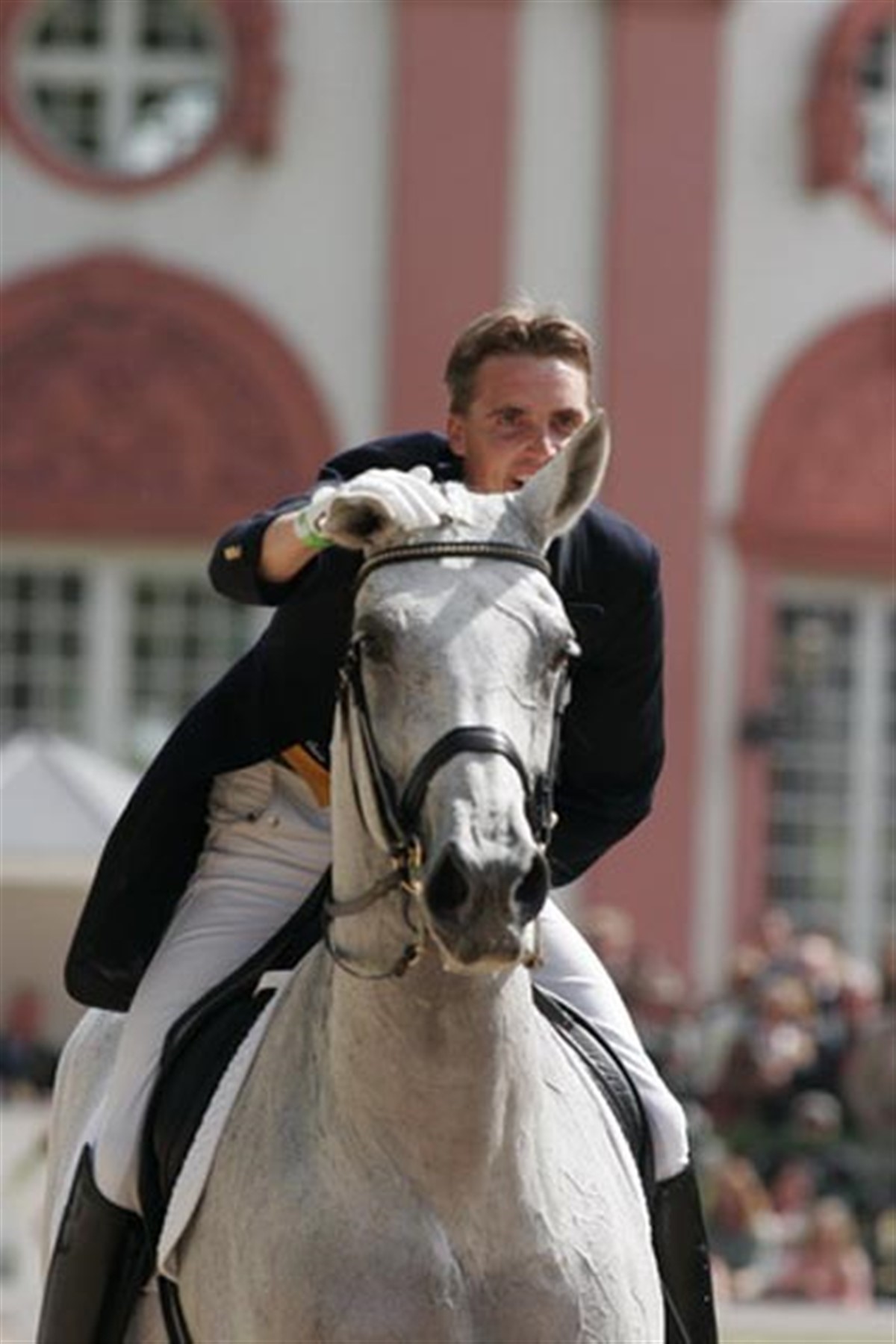 Andreas Helgstrand var helt ustyrlig i Wiesbaden søndag eftermiddag og aften. Først leverede han et drømmeridt på Martine i Grand Prix-klassen - et ridt som blev honoreret med over 76% og for den sidste piaffe/passage fik han karaktererne 10 10 10 9 9 af dommerne. Publikums jubel ville ingen ende tage og Andreas selv viste så meget medrivende begejstring for sin smukke hvide hoppe, at en kvindelig håndboldspiller må misunde ham. Det var også glædeligt at Fie Skarsø og Münchhaussen i denne klasse viste gode takter forud for WEG i Aachen, da hun red hingsten til 69% Lone Jørgensens Ludewig G havde en lille offdag, som Lone håber på at forbedre i dagens Special. Knapt havde euforien lagt sig i den danske lejer, før rytterne igen skulle i aktion til aftenens kür i projektørlys foran det smukt oplyste slot. Første dansker i aktion var Prinsesse Nathalie på 8-årige Digby. Hun viste et smukt, harmonisk program, med meget flotte piaffer, smukke pirouetter og mange gode momenter. Da Andreas red Cavan på banen til slut i hans velkendte kür var spændingen i den danske lejer i alarmberedskab - ville det lykkes at gøre det for tredje gang i Wiesbaden? Det gjorde det - ikke en hov satte Cavan forket og dommerne honorerede ridtet til over 80% Arrangørens hjemmeside