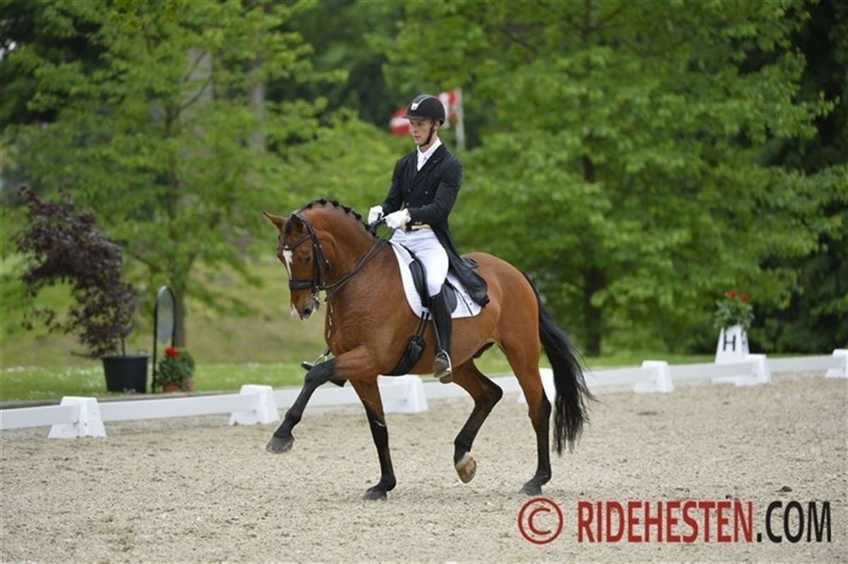 Otte ekvipager er til start i mesterskabet i dressur for U25-ryttere på Broholm her i Pinsen. Rytterne lagde ud i Intermidiaire II, og det var Anna Kasprzak som kom bedst fra start i mesterskabet. Anna er regende mester for seniorer på Donnperignon, men da han er blevet opereret i øjet (se artikel i magasinet Ridehesten juni nummer) har hun istedet valgt at starte UVM guldvinderen Hønnerups Driver e. Blue Hors Romanov fra Stutteri Hønnerup i mesterskabet for U25. Det er Annas sidste år i denne aldersgruppe, men omvendt, så var det Hønnerups Drivers første Intermediaire II-klasse i karrieren. Som man kunne læse i magasinet Ridehestens juni-nummer, så har Driver haft forskellige skader de seneste par år, og det er først indenfor de seneste knap to måneder, at Anna har kunne træne den imponerende hest kontinuerligt. I dagens konkurrence opnåede de 71,8% med bl.a. 9 for travøgninger og 8 for passage. Et lille kiks ud af den første pirouette, der tæller dobbelt, kostede lidt i regnskabet.