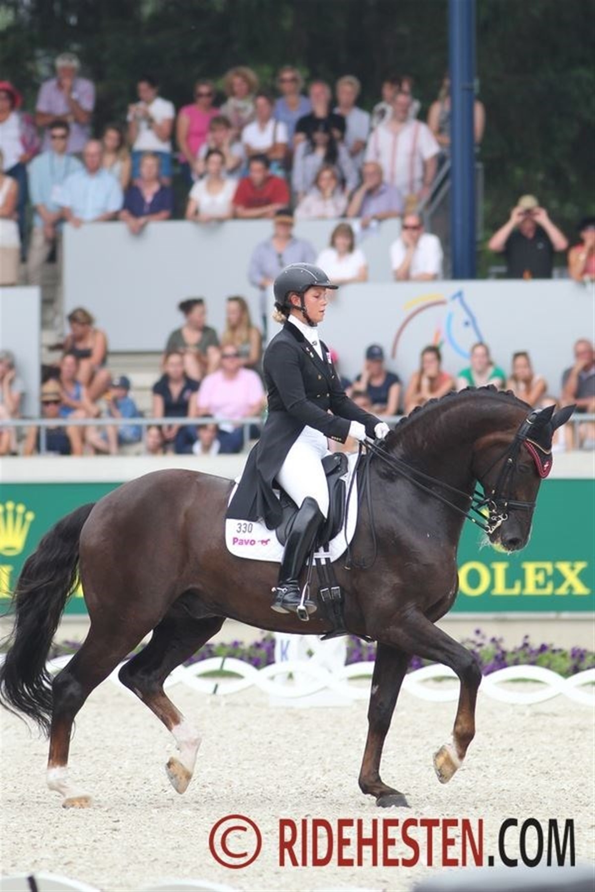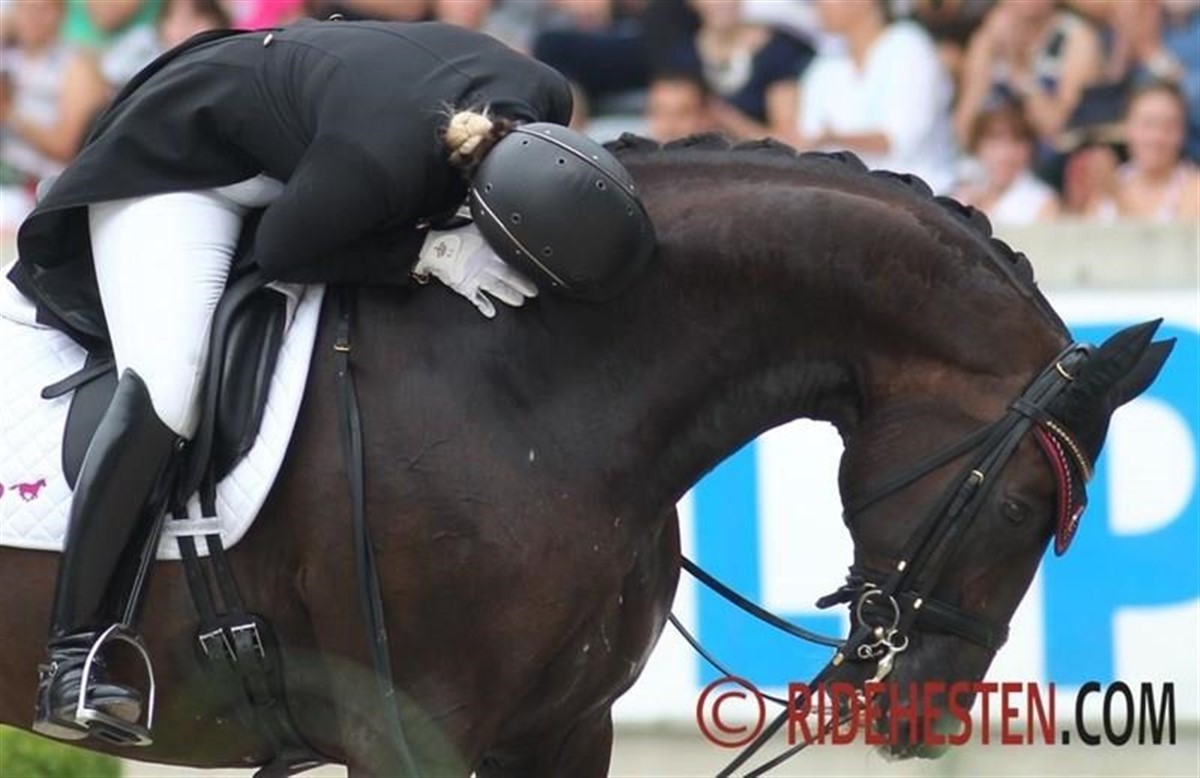 Så har Anna Kasprzak lige været på banen og red sin flotte, meget svære og velkomponerede Kür. Veloplagt og energisk og trods en stor fejl i changementerne for hvert andet galopspring opnåede hun det super resultat på 82,125%. Det var foran Adelinde Cornelisen fra Holland, og det var også bedre end Michael Eilberg fra Storbritanien, som med sin dejlige skimelhoppe Half Moon Delphi har en af de smukkeste piafferende heste overhovedet. Der er kun fem ryttere tilbage i klassen, de fem bedste, og da Anna indtil nu fører klassen, betyder det, at hun i hvert tilfælde er blevet nummer seks blandt verdens allerbedste ryttere. Det er imponerende og det er dejligt for dans dressursport.