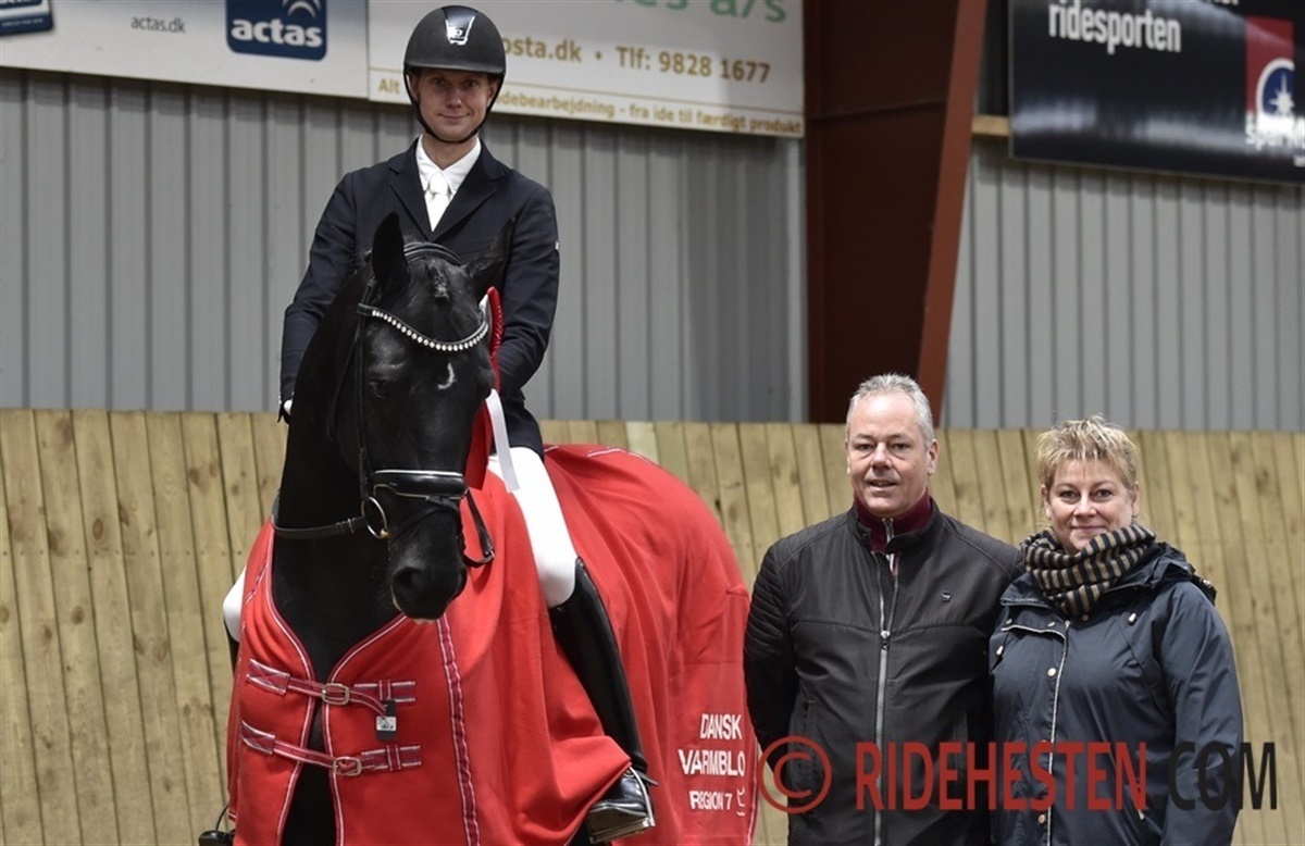 Zhaplin Langholt e. Zonik/Stedinger opdrættet af Bente Graasbøll & Ole Magnus Jensen og ejet af Helgstrand Dressage. Rytter: Søren Wind Resultat: 930 point.