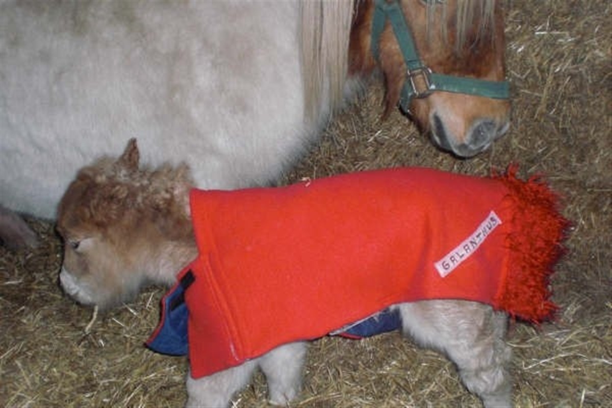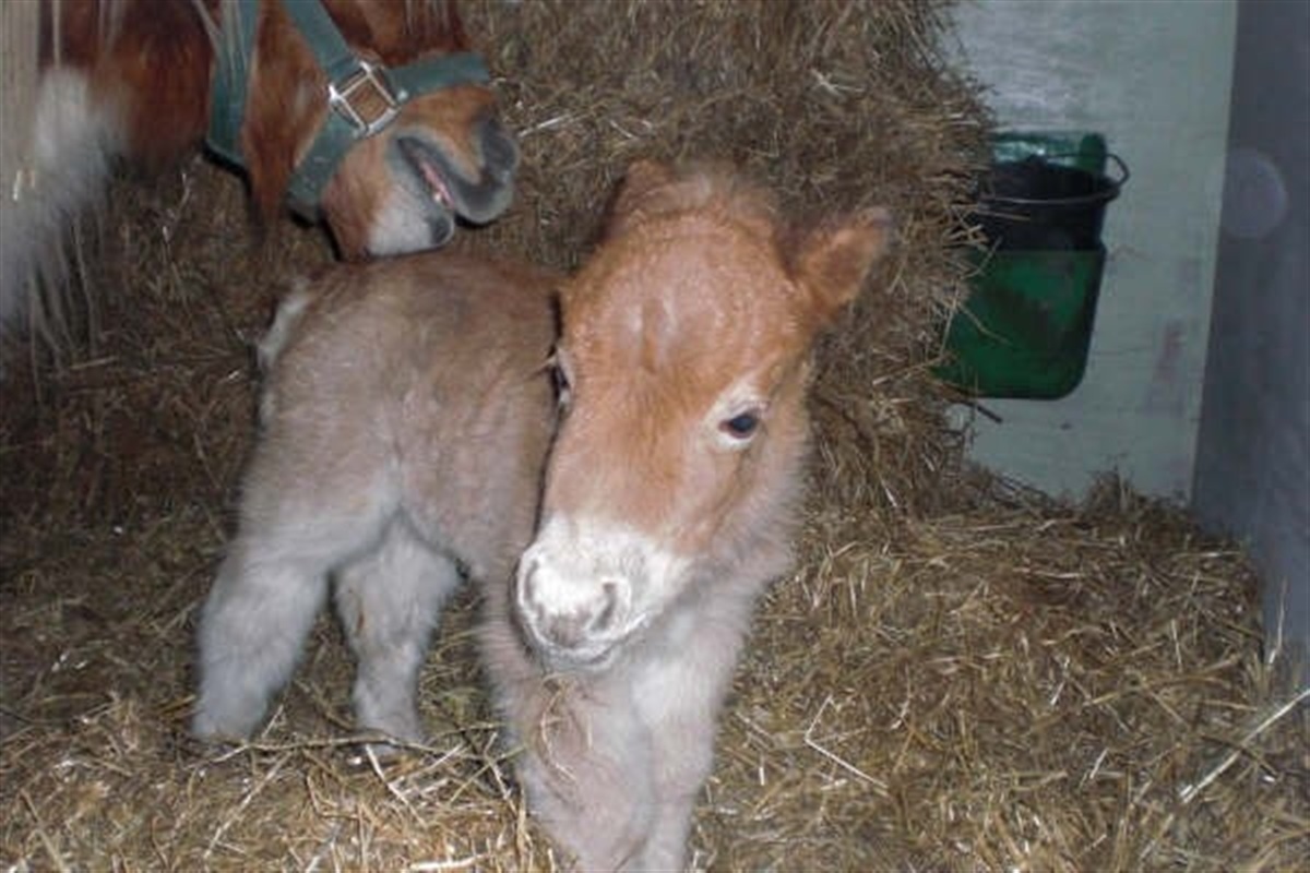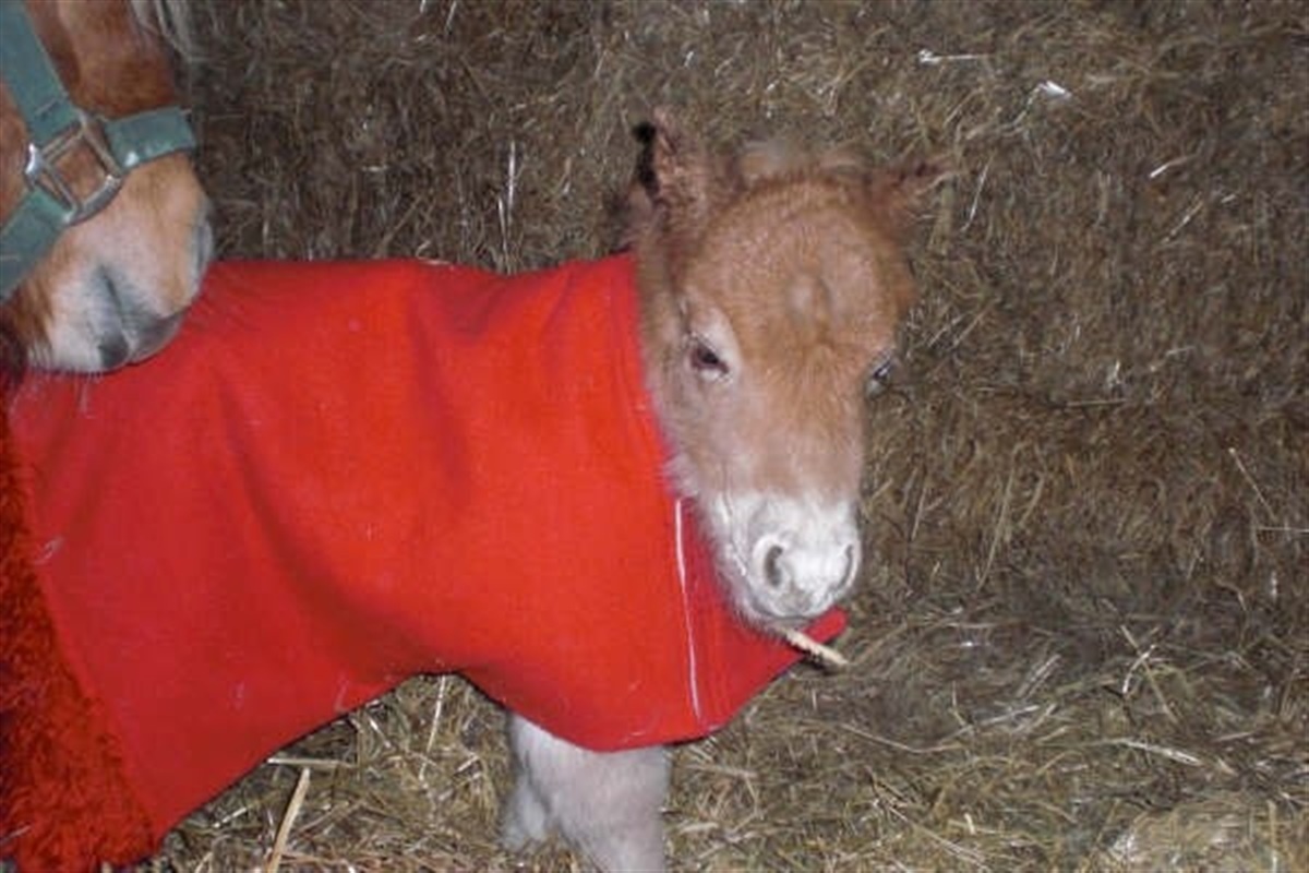 Kl. 13.15 torsdag d. 2. januar 2009 fik vi et lille shetlandshoppeføl på bare 50 cm, fortæller en glad, men overrasket Janni Noesgaard til Ridehesten. Sidste år i januar købte hun shetlænderen Monica Hagenstrup. Hun skulle være ifolet, så Janni lod hende trygt gå sammen med gårdens hingst. Det viste sig dog ikke at være tilfældet. For i torsdags kørte Jannis nabo forbi folden og kom løbende ind til Janni med meddelelsen om, at de hellere måtte skynde sig at komme ud - shetlandsponyen folede! Dermed kom det lille hoppeføl til verden i 5 graders frost, og hun blev efterfølgende båret ind i stalden, men hun blev ved med at fryse selv i den varme stald. Om aftenen lavede de så en halmhule til hoppen og føllet, og de syede et minidækken til det forfrosne føl. Trods den kolde fødsel, har mor og barn det rigtig fint.