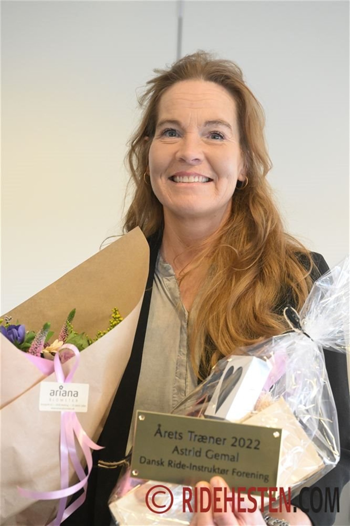 Derfor var det også velfortjent, at det blev Astrid Gemal, som Dansk Rideinstruktør-forening udnævnte som Årets Træner. Det var en tydeligt stolt Astrid, der modtog prisen under klapsalver fra sine berider-kollegager i en af Jyske Bank Boxens Sky-rooms fredag til Dansk Varmblods Hingstekåring 2023. Hun fik en guldplakette og en buket blomster overrakt af Kristian Skovrider.