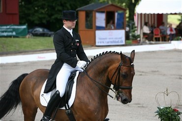 Den 9-årige kårede trakehnerhingst Aston Martin e. Monteverdi/ Sixtus (opdr. Lone H. Andersen) er uddannet af John Hvalsøe Saul, der har haft succes med hingsten på dressurbanerne, hvor ekvipagen to gange har repræsenteret Danmark ved UVM for ungheste i Verden, Tyskland, og sidenhen har opnået sejre og placeringer op til Intermediaire II. Aston Martin er kåret i både TAF og DV og har 124 afkom registreret i Danmark.