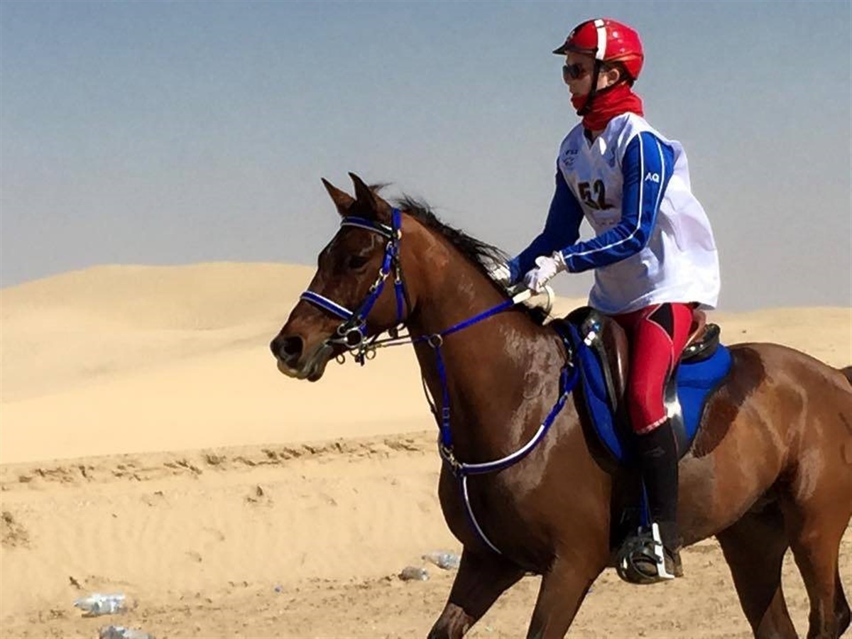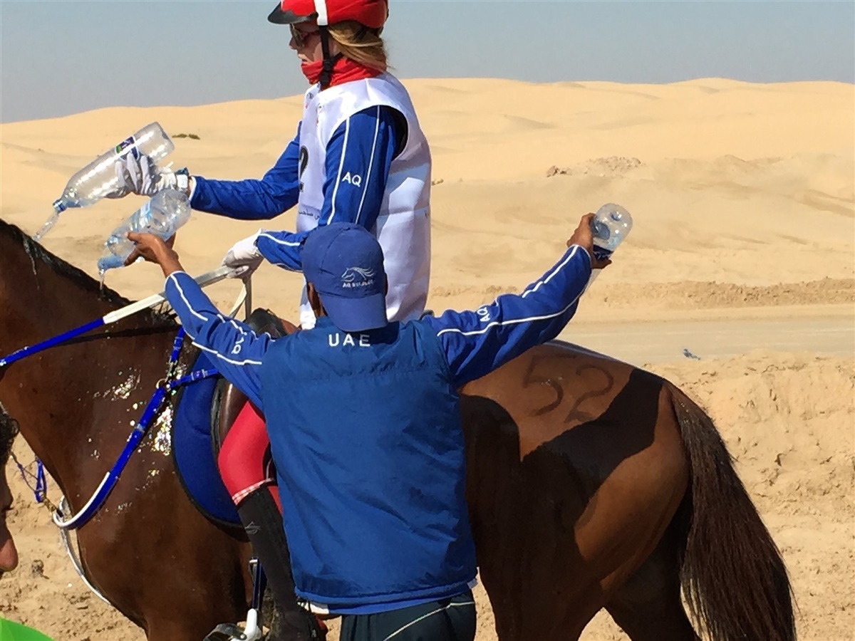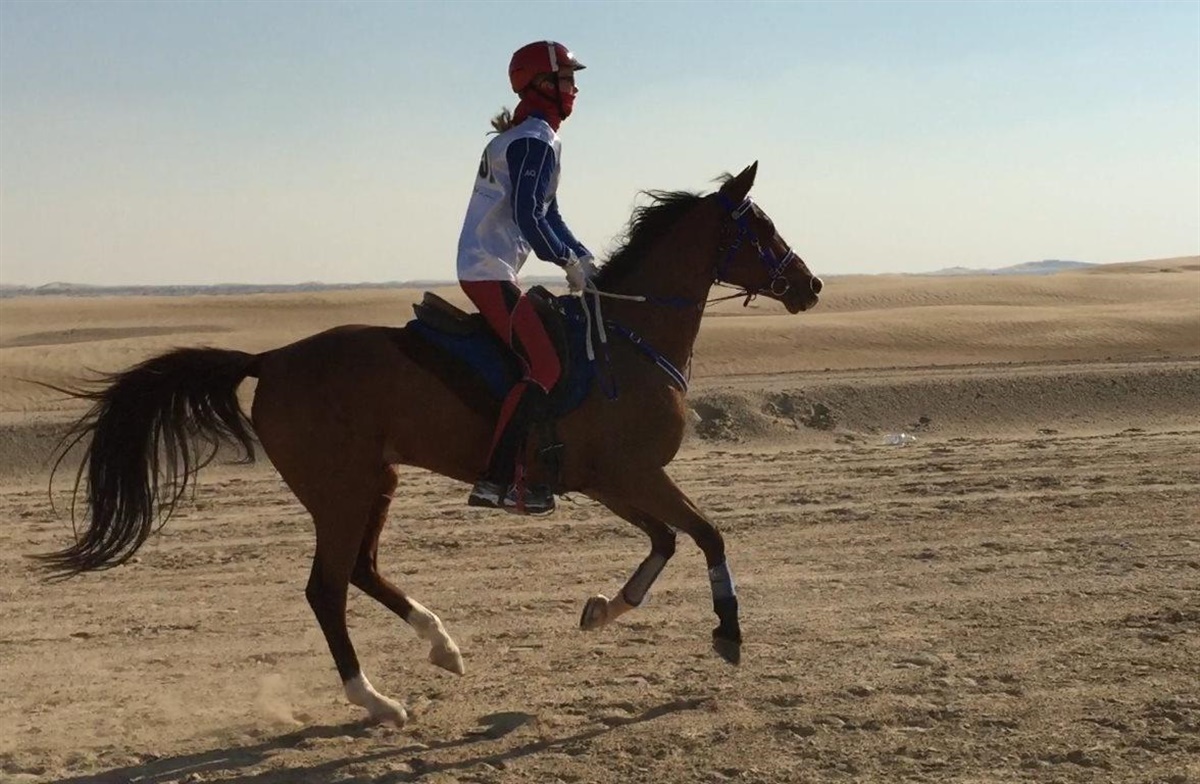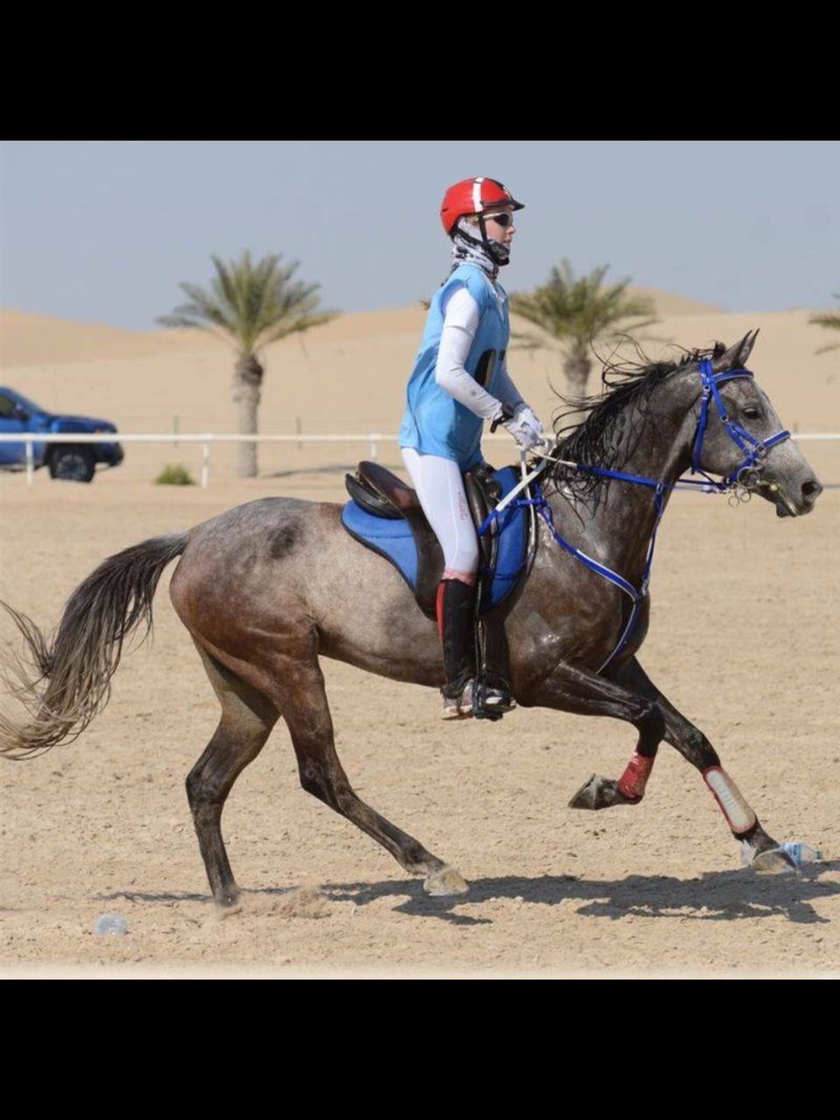 Jeg har været så heldig at have haft muligheden for at ride i UAE, hvor solen altid skinner og hestene er virkelig gode. Det startede med, at en tysk kvinde, som har heste i Dubai, i 2014 havde brug for en europæisk ungrytter. Hun havde kontaktet Tanja Van Willigen, som med det samme kontaktede mig, og der gik ikke længe før vi havde bestilt flybilletterne. Tingene ændrede sig dog lidt undervejs, og jeg skulle i stedet ride på en af Sh Faisal Bin Saqr Al Qassimi’s heste. Ejeren er en af sheikerne i Dubai, og havde på det tidspunkt en stald med ca. 50 distanceheste. Jeg endte med at skulle ride på en hest der hedder Run Du Colombier, som var en stor og stærk hest. Jeg skulle ride et ridt som hedder Presidents Cup for ungryttere og distancen var 120 km. På det tidspunkt var jeg kun 15 år gammel, og det var første gang jeg skulle ride 120 km. På stalden er der ansat en træner, som kender hestene ud og ind, og han var rigtig god til at fortælle mig både til træning, før og under stævnet, hvordan jeg skulle ride, for at hesten var mest tilpas og havde bedst mulighed for at gennemføre stævnet. Det var en virkelig stor dag, og jeg var meget spændt på hvordan det skulle komme til at gå, men jeg følte mig også tryg, da træneren ville køre ved siden af os i en bil under det meste af stævnet. På den måde kunne han hele tiden se hesten, og fortælle om jeg skulle gøre noget anderledes. Det var en helt fantastisk dag, og jeg var virkelig imponeret over hvor professionelle teamet var omkring hestene. Vi endte med at gennemføre med en gennemsnitshastighed på 24,19 km/t og det rakte til en 13. plads. Vi var alle sammen super glade for at det gik så godt, og med en hest som hev i tøjlerne hele vejen!