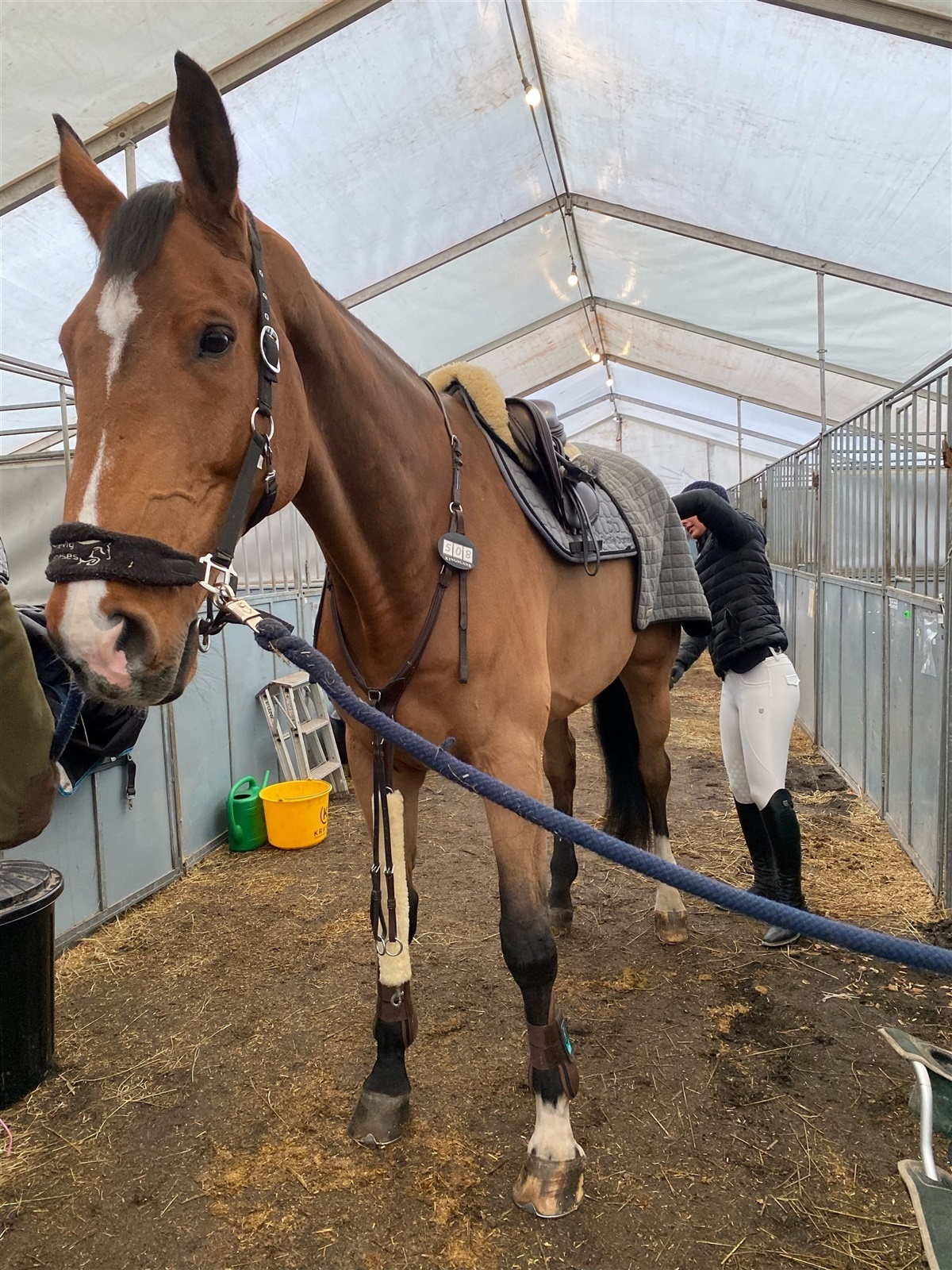 Derudover fortæller Cecilie lidt om, hvordan det er at ride Coldstream. For selvom han er stor, er han følsom, så fokus er på så vidt muligt ikke at forstyrre ham for meget på banen. Hvis man lykkes med det, er han til gengæld nem og sød, og det blev da også til en fejlfri runde til ekvipagen i MB* ved Christmas Show Warm Up. Sammen har ekvipagen tidligere debuteret i 130 cm og startet deres første internationale stævner. Hvad fremtiden bringer vides ikke, men en ting er sikkert: ”Tårnet” skal blive hos Cecilie.