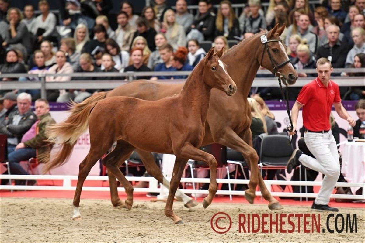 Senere på aftenen købte Victoria Max-Theurer endnu et smukt hoppeføl. 1 flaske champagne blev til to efter et hammerslag på 13.000 euro (cirka 97.00 0 kr) for den røde stjerne Overgaards Vanity e. Blue Hors Veneziano/ Londonderry (opdr. Tove og Ove Møller Nørgaard).