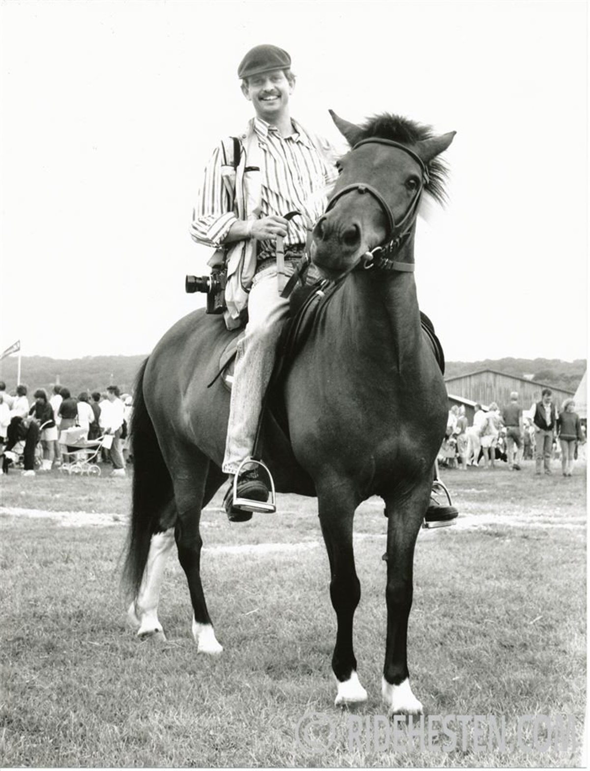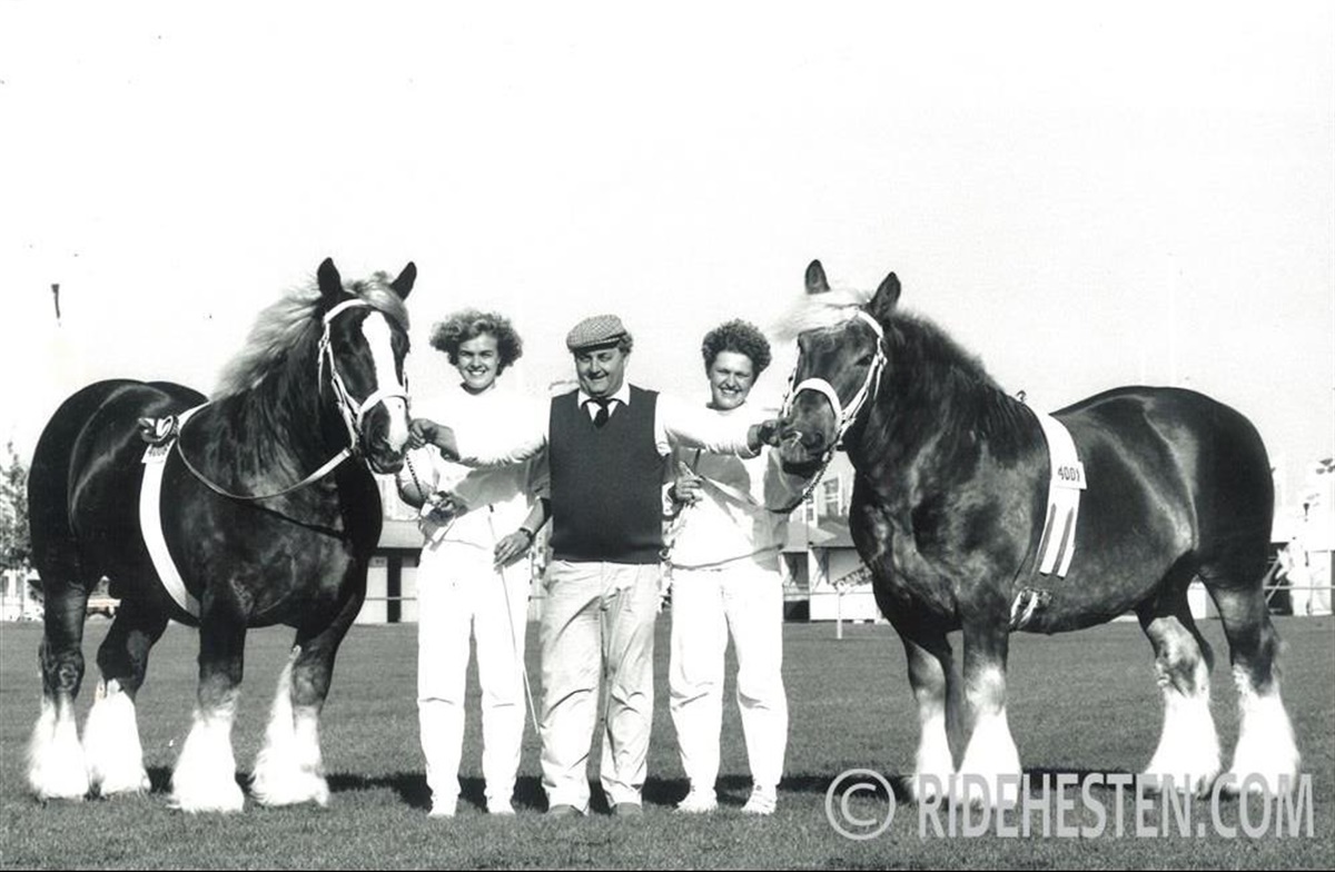 Fra Landsskuet i Herning 1990. I midten er det Bent Høgh, den stolte ejer af to flotte fyre, de jyske hingste Højvangs Zanto t.v. og Ørn t.h. Trækkerne er Karina Christiansen t.v. og hestepraktiserende dyrlæge, Helle Dalsgaard t.h.