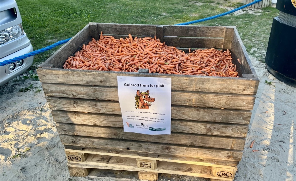 Det er DanRoots i Tange, der har sponsoreret intet mindre end 4000 kg. sprøde snack-gulerødder, som nu er fordelt i en stor kasse ved udgangen af banen. Her er der gulerødder til fri afbenyttelse til både denne uges stævne, Bækgaarden Horse Festival, ligesom der også vil være gulerødder til ponyrytterne til næste uges Bækgaarden Pony Festival.