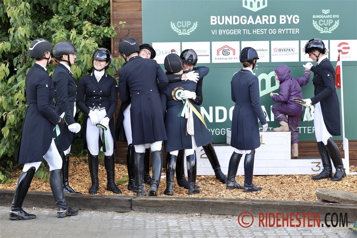 Lørdag eftermiddag red første rytter på banen til dette års Bundgaard Byg Cup, der gik i en Intermediare 1, mens himlen åbnede sig og regnen silede ned. Efter 16 flotte, men meget våde ridt, var der ingen tvivl om, hvem vinderen af den indledende runde var. Susanne Barnow red sig nemlig igennem den store vandmængde med sin fantastiske 8-års vallak, Skovdals Dexter e. Hesselhøj Donkey Boy/ Blue Hors Romanov, med et imponerende flot ridt, der blev belønnet med hele 73,640%, og dermed kunne Barnow stille sig øverst på sejrsskamlen, og så endda på hjemmebane. En anden ekvipage, der ikke lod sig kue af regnen var Nana Berg Christensen og Weltstar's Salvator e. Sezuan/ Weltjunge. Parret red ligeledes et flot program, der sikrede dem andenpladsen med 69,693%. På tredjepladsen og lige i hælene på Nana, fandt vi Pernille Lindberg Nielsen på Quibiz Z e. Quaterback/ Bøgelys Camaro, der sluttede med 69,211%.