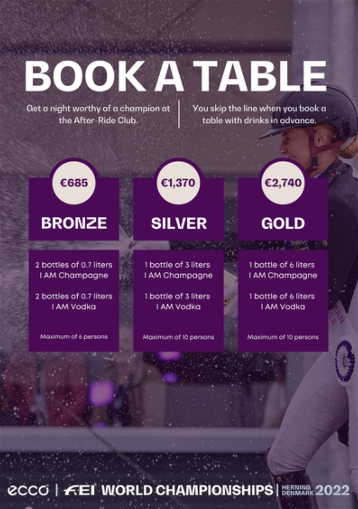 Man kan vælge mellem et bronze-, sølv- eller guld-bord, hvor der er forskellige mængder drikkevarer inkluderet. Bordene er for henholdsvis op til seks, ti og ti personer. Læs mere om mulighederne og book et bord i VM's NATKLUB.
