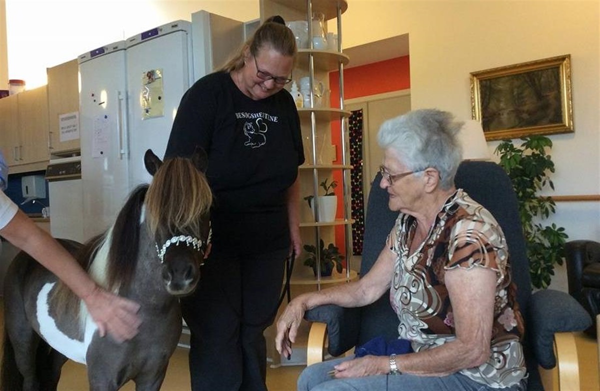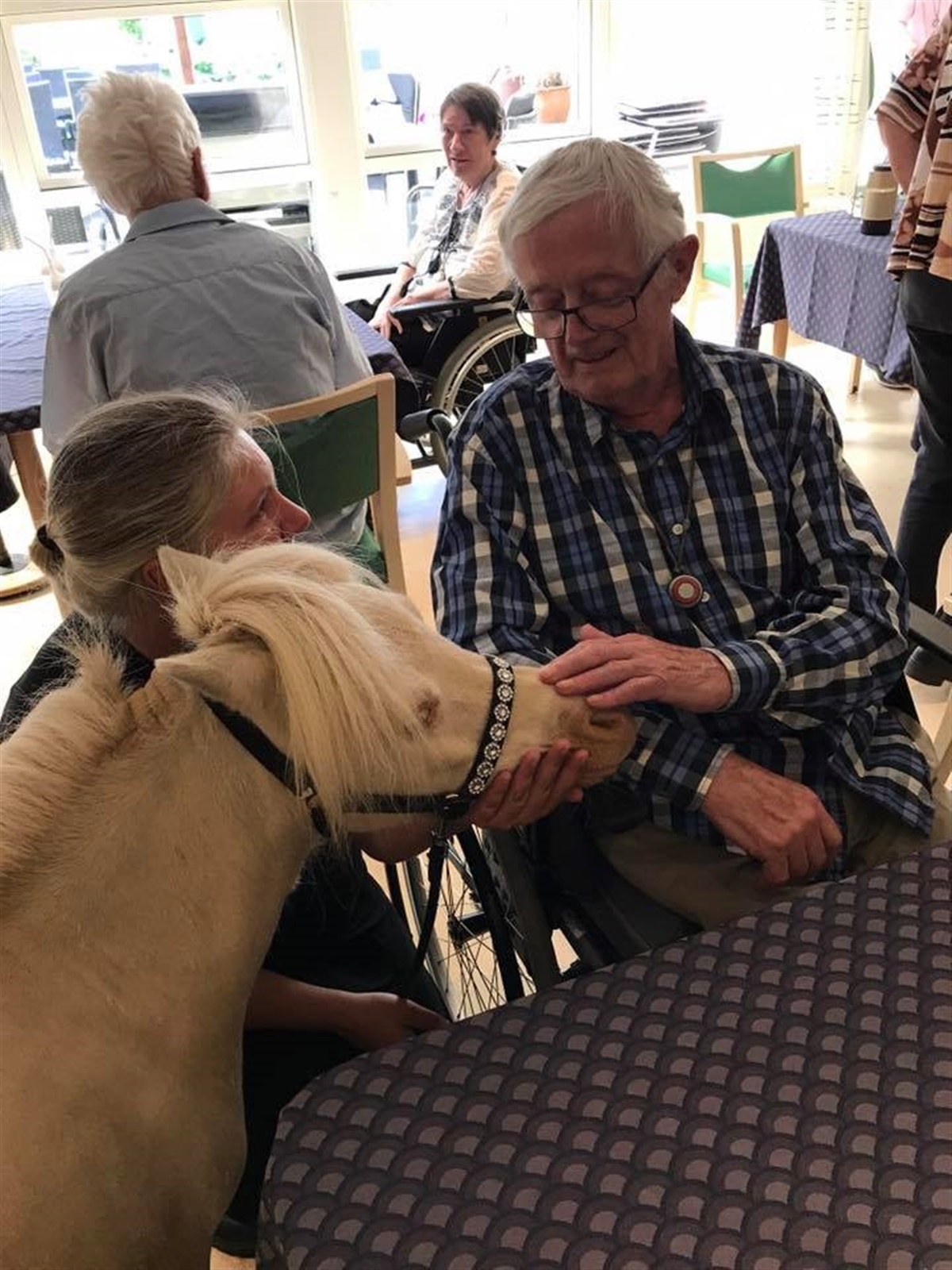 – Miniaturen er en dejlig og lærervillig hest i en lille krop. Det betyder utrolig meget for de ældre at røre ved en blød hestemule og se i de store mørke øjne. Hele sanseoplevelsen vækker genkendelse hos mange demente, som for et kort øjeblik vågner op, når de rører ved vores heste, fortæller Betina Fabricius Olsen.