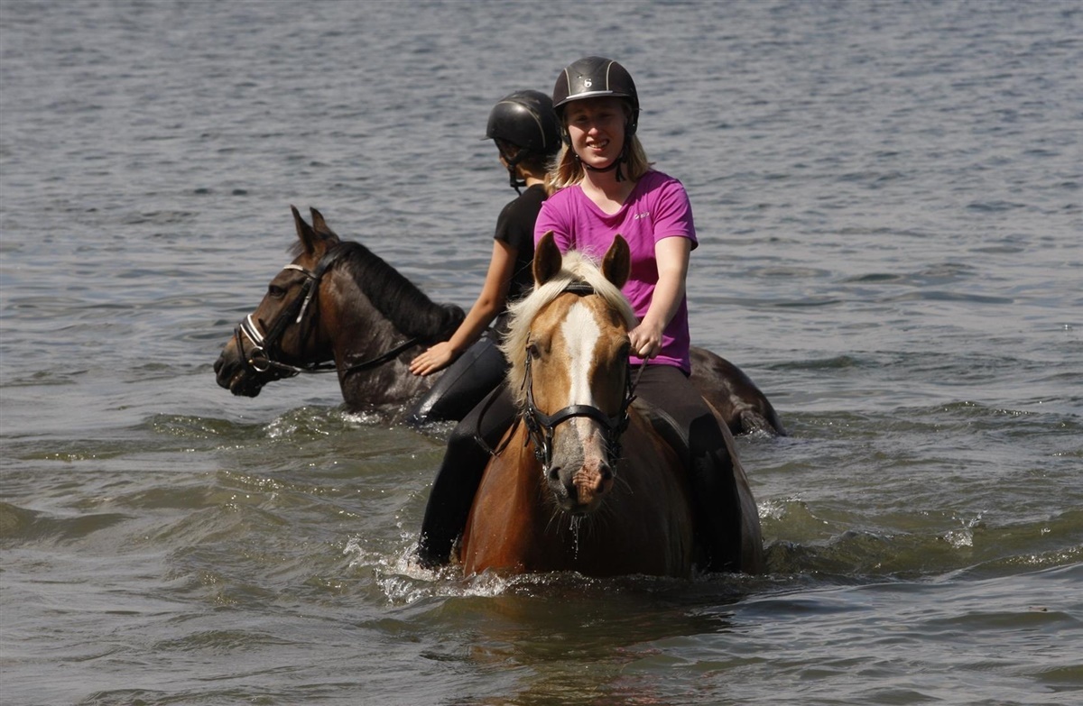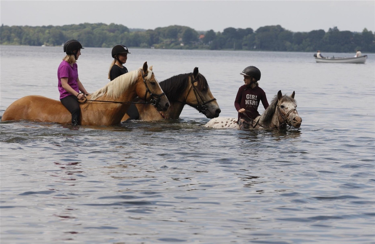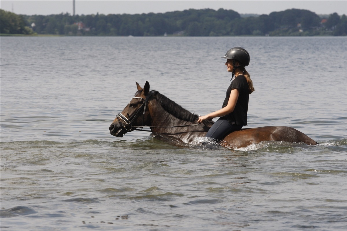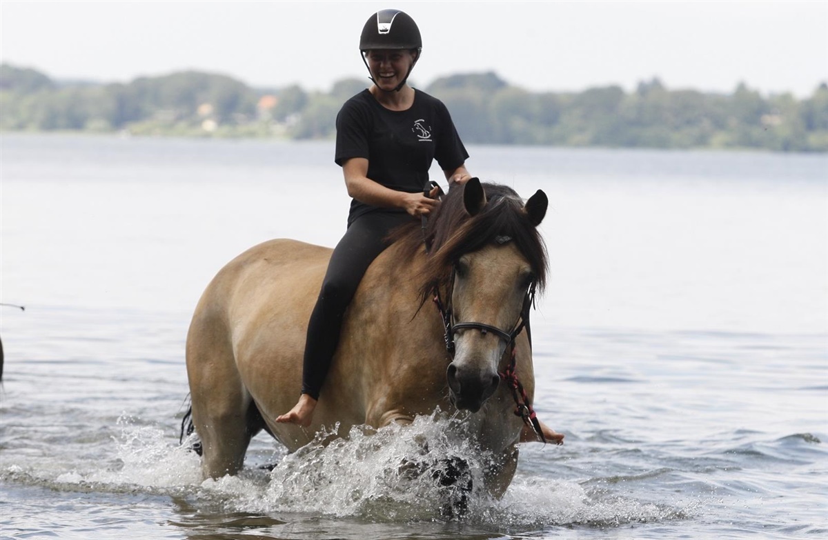 – Sørg for, at der er en hest med, som kan lide at gå i vandet, og lad den erfarne hest gå forrest, så vil den anden som regel følge med, siger Charlotte Tardrup, at man starter roligt ud, især hvis hesten er utilpas. Første gang kan den evt. bare nøjes med at stå med hovene i vandkanten og snuse lidt til vandet. Det kan være svært at forudsige, hvordan ens hest vil reagere, hvis den ikke har prøvet det før.