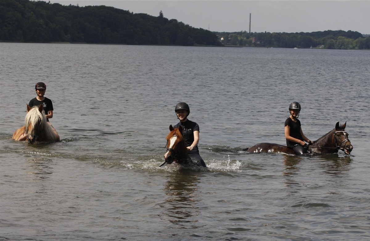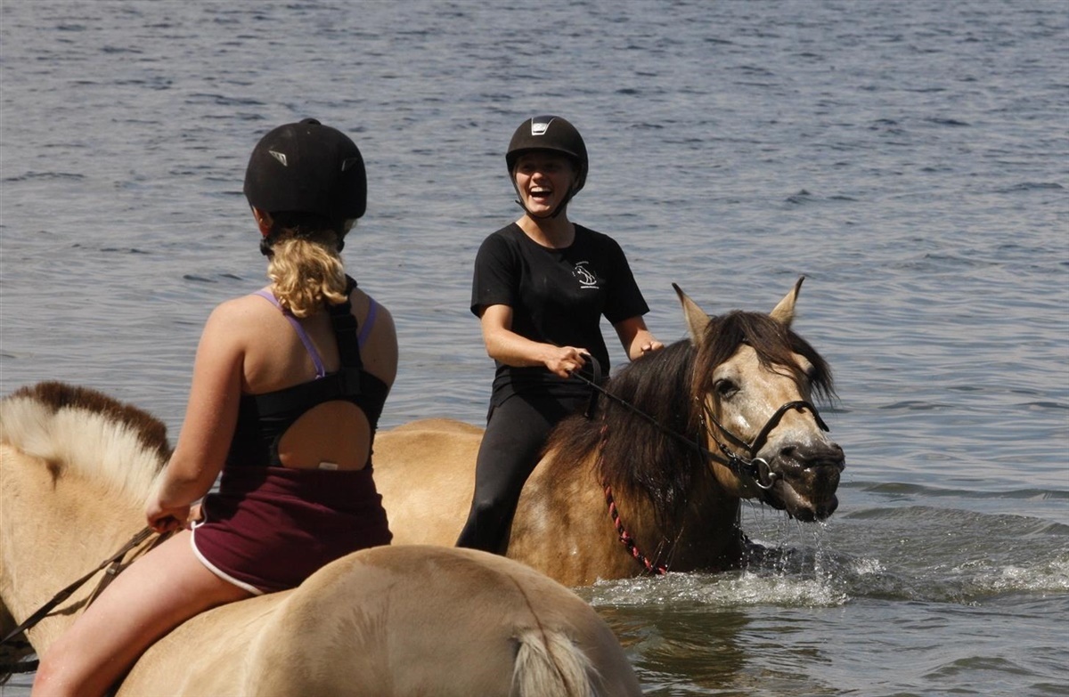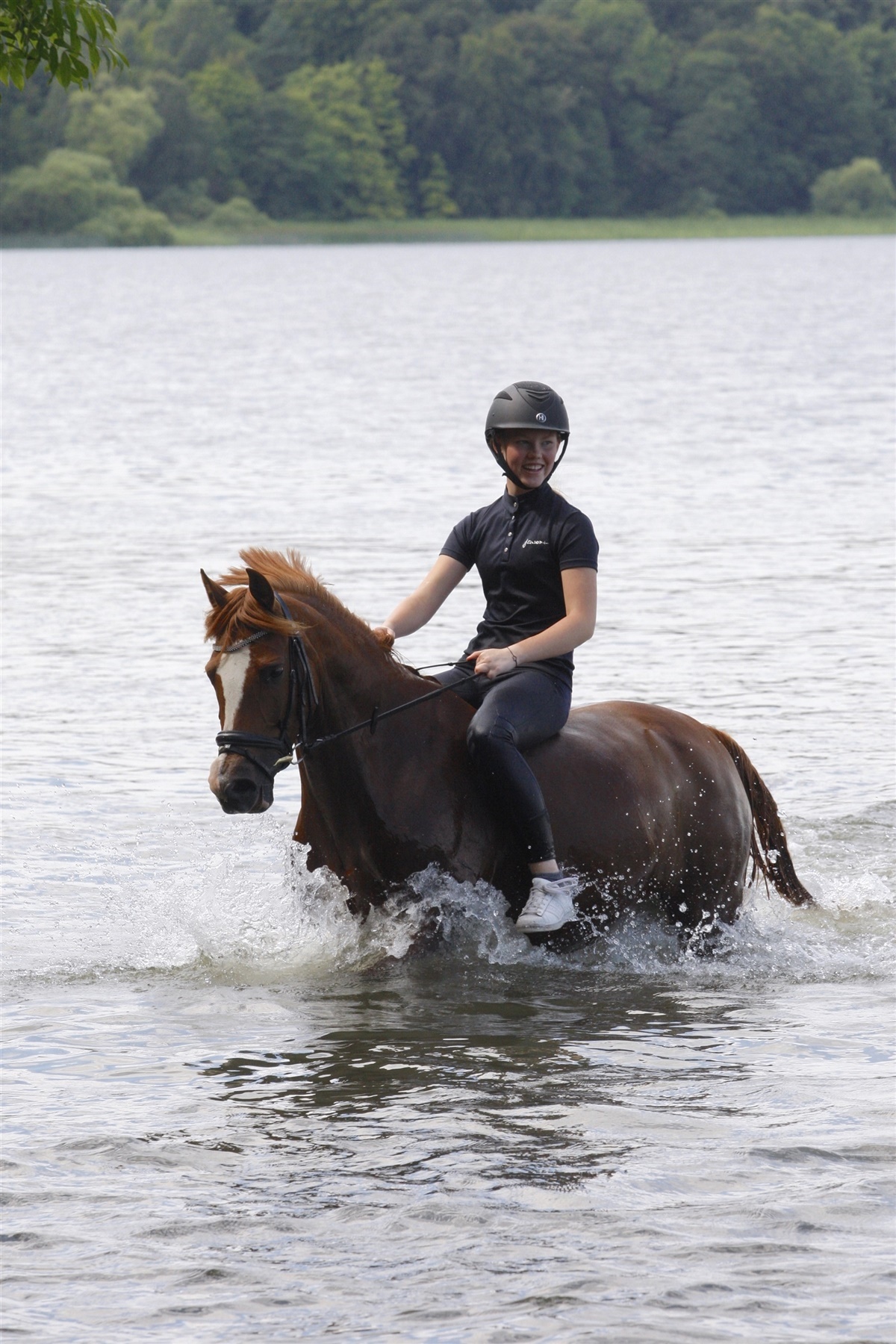 – Sørg for, at der er en hest med, som kan lide at gå i vandet, og lad den erfarne hest gå forrest, så vil den anden som regel følge med, siger Charlotte Tardrup, at man starter roligt ud, især hvis hesten er utilpas. Første gang kan den evt. bare nøjes med at stå med hovene i vandkanten og snuse lidt til vandet. Det kan være svært at forudsige, hvordan ens hest vil reagere, hvis den ikke har prøvet det før.