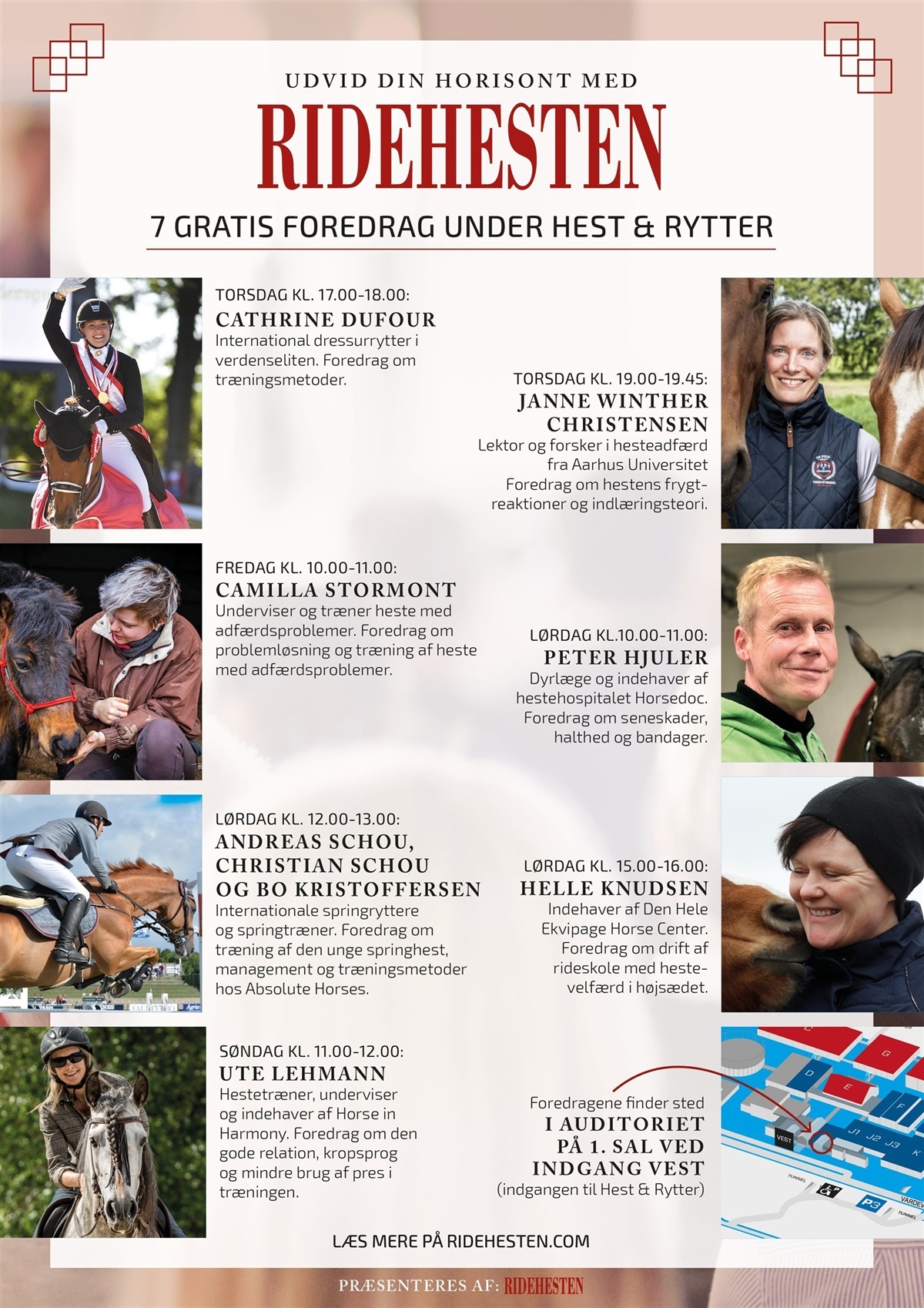 Cathrine Dufour er en af de foredragsholdere, som Ridehesten har samlet til arrangementet ”Udvid din horisont med Ridehesten”. Til Dansk Varmblods Hingstekåring vil syv foredragsholdere forsøge at gøre jer klogere på hver sin del af hesteverdenen. Foredragene finder sted under Hest & Rytter-messen i auditoriet på 1. sal ved indgang Vest og er GRATIS for alle besøgende. Cathrine Dufours foredrag finder sted torsdag d. 5/3 kl. 17-18
