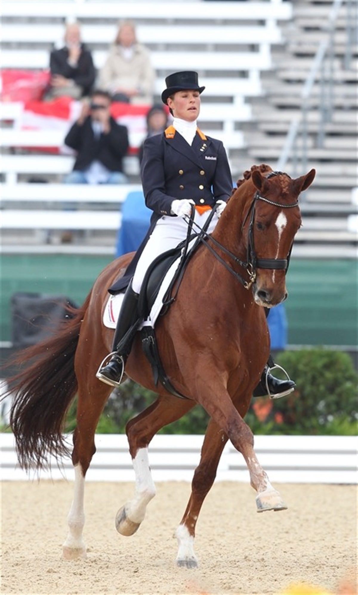 Resultattavlen viste en foreløbig score på 80% efter Adelinde Cornelissen og Jerich Parzival havde vist deres flotte travøgning, men da hun parerede foran dommerne lød klokken, og Adelinde måtte forlade banen, Parzival havde bidt sig og han skummede rødt om munden. Ærgerligt for den hollandske rytter, der har været meget uheldig ved World Cup finalen i Las Vegas blev Parcival skadet på opvarmning og kom ikke til start. Ved OL i Hongkong var de reserver, men ved EM sidste år var de med på det guldvindende hollandske hold. I praksis betyder diskvalifikationen i dag, at Adelinde er ude af VM konkurrencerne, for det hollandske landshold får det dog ingen betydning, idet de får Edward Gal og verdensstjernen Totilas på banen i eftermiddag, og det par skal nok kunne redde dagen for hollænderne.