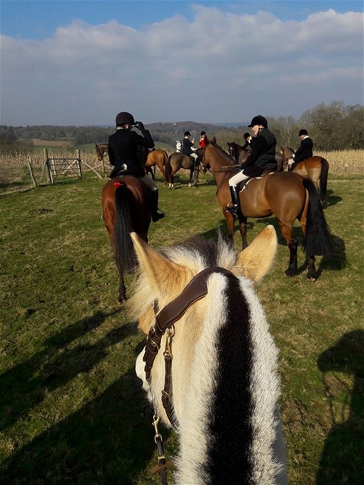 Jeg har været med til to jagter herovre. Den ene var i december. Her var der desværre ikke mulighed for nogen spring, og der var mange stop under jagten. Det var sjovt at prøve, men umiddelbart fandt jeg det meget koldt og lidt halvkedeligt, da vi stod stille meget af tiden. Den anden jagt, jeg var til, var en del sjovere. Det var her i februar, og der var masser af mulighed for spring. Dog var det så koldt og blæsende den dag, at jeg stoppede lidt før tid. Merkur havde også gjort det rigtig godt og sprunget alt jeg havde bedt ham om, så jeg var meget glad og tilfreds. Derudover var vi meget tæt på at fange en ræv, men den nåede at slippe væk. Den var en superfed og sjov oplevelse, specielt i den fantastisk smukke natur, de har her på Slades Farm i Surrey, i England.