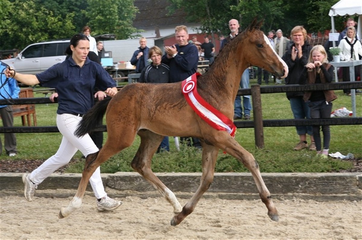 Med blot enkelte regnbyer holdt vejret sig ved det acceptable under Blue Hors Følchampionat, der var godt besøgt af avlere og hestehandlere fra såvel Danmark som bl.a. Holland, Tyskland og Sverige. For den 4-årige hingste Blue Hors Zack blev championatet en stor succes, idet både bedste hoppe- og hingsteføl blev afkom efter den unge hingst, hvis hollandske avlere var kommet for at følge dens føl. Bedste hoppeføl blev kat. nr. 131 Ringsbo's La Z Blue mf. Blue Hors Don Schufro, opdrættet af Stald Ringsbo v/ Louise Ringsbo, Assens. Bedste hingsteføl blev kat. nr. 226 Thuzack mf. Heslegårds Rubin, opdrættet af Birgit og Carsten Tørholm, Holmegård. Søndag vil denne nyhed blive opdateret med et fotogalleri med indtryk fra dagen.