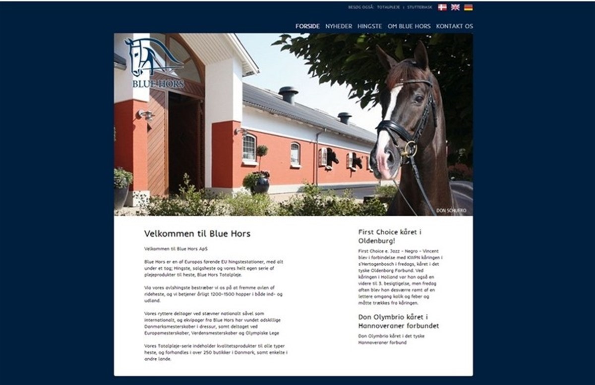 Den danske hingstestation Blue Hors ApS er absolut toneangivende i international dressurhesteavl og -sport. Mens Blue Hors' salgsstald leverer heste til kunder verden over, så producerer avlshingstene føl i hele verden. De leverer i bedækningssæsonen kølesæd i en stor del af Nordeuropa, mens frostsæd er tilgængeligt hele året rundt - stort set over hele verden. Med 20 års erfaring har virksomheden skabt sig en stærk international profil, hvorfor det er vigtigt også at kunne profilere sig internationalt og professionelt på internettet. Blue Hors byder i dag velkommen til en fornyet hjemmeside, der skal gøre det overskueligt og behageligt for kunder, danske såvel som udenlandske, at navigere rundt i virksomhedens virtuelle univers. Som samarbejdspartner ønsker Wiegaarden tillykke med en meget flot side.