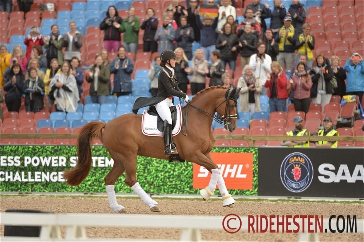 Isabell Werth var selv vældig tilfreds med sit ridt i dag, men kunne have ønsket den første piaffe lidt flottere, men Weihegold gik ubesværet gennem programmet, og Isabells trak på sin store rutine og hentede points overalt. Hun opnåede 83,613%