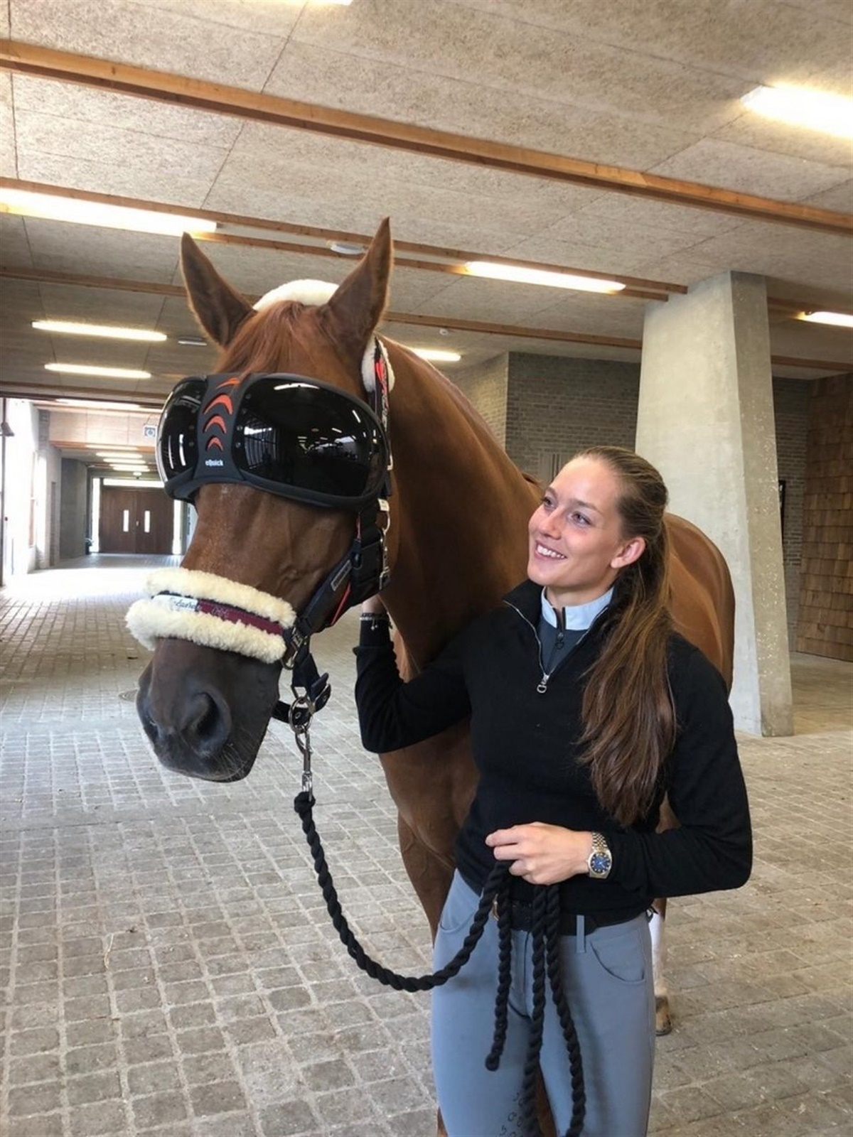 Atterupgaards Cassidy, som sammen med Cathrine Dufour netop har vundet bronze ved EM, har taget godt imod de smarte eVysor solbriller fra eQuick, som beskytter hestens øjne. Det er ikke kun Cathrine der bruger brillerne til hestene, men også andre topryttere har taget godt imod dem. Blandt andet den norske juniorrytter Ada Braten Johnsen og den finske U25-rytter Emma Tallberg.