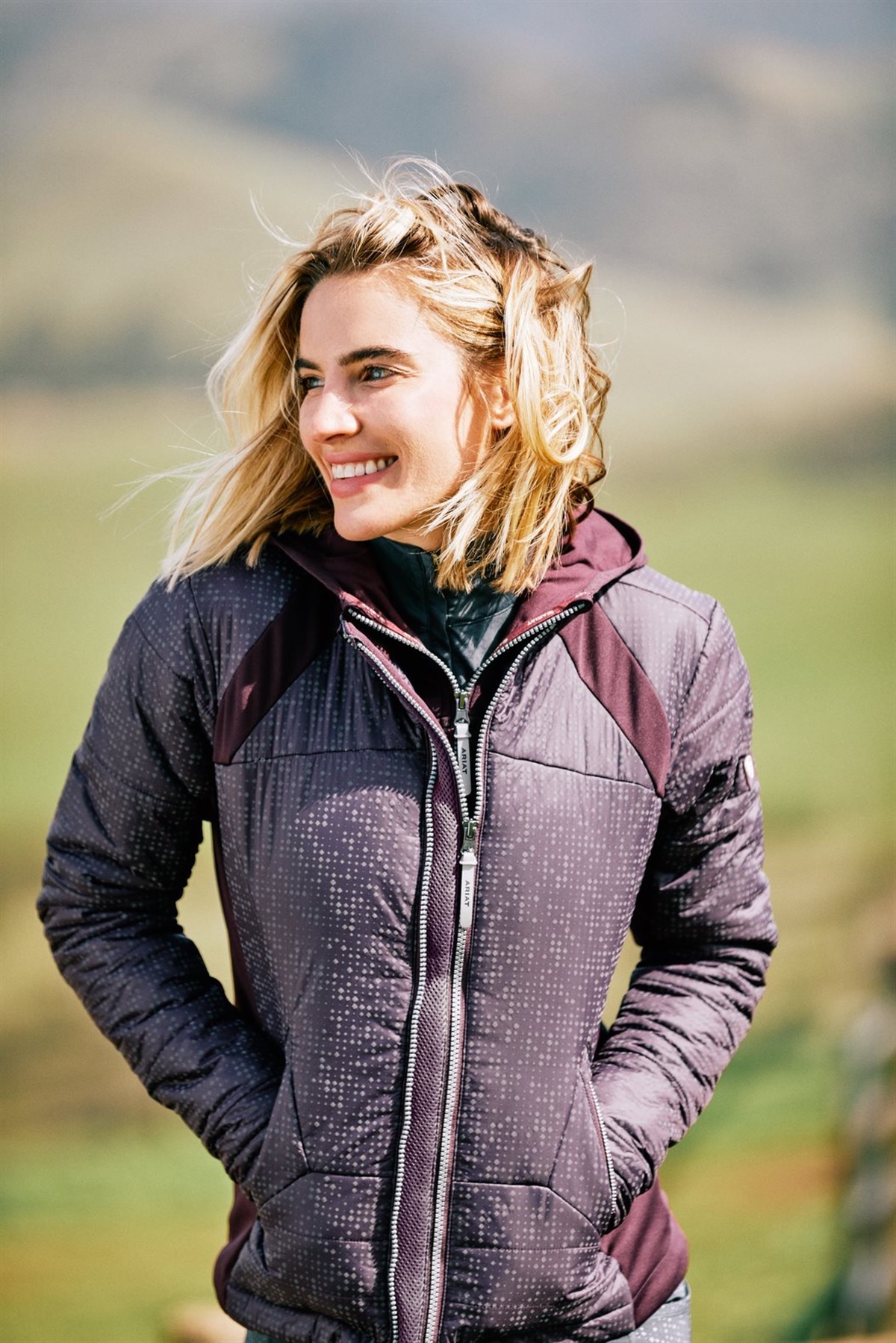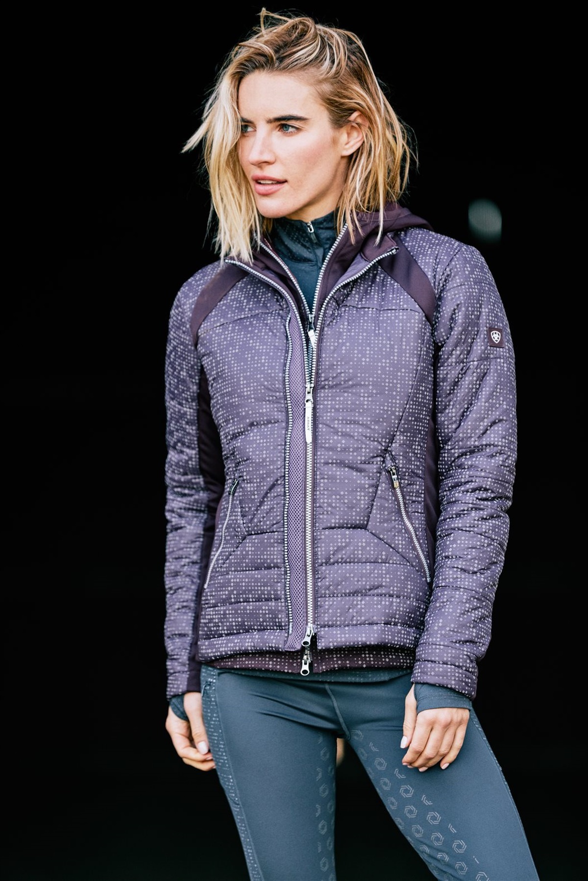 Ariats EcoDRY Lumina-jakke, der er et helt nyt design til sæsonen, er både praktisk, stilfuld og introducerer forskellige egenskaber, der giver både beskyttelse og kropskontrol for rytteren. Det reflekterende yderstof fås i to farver, ”Mulberry” og ”Ebony”, som gør det til en iøjnefaldende beklædningsdel i både lys og mørke. Udover et lækkert design er Lumina-jakken også vind- og vandafvisende og er dermed ideel til efterårets vejrforhold.