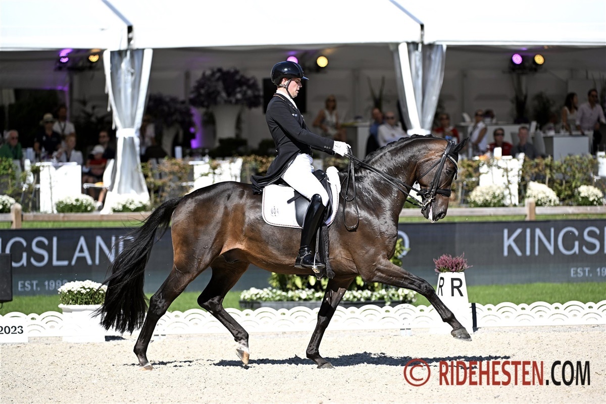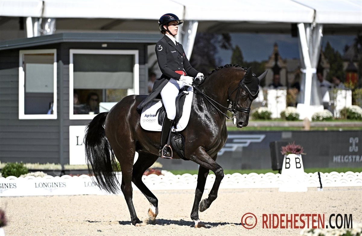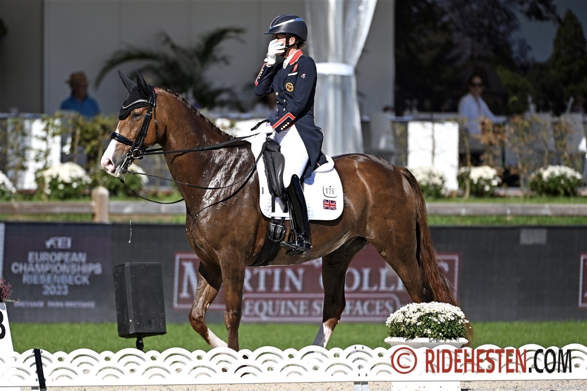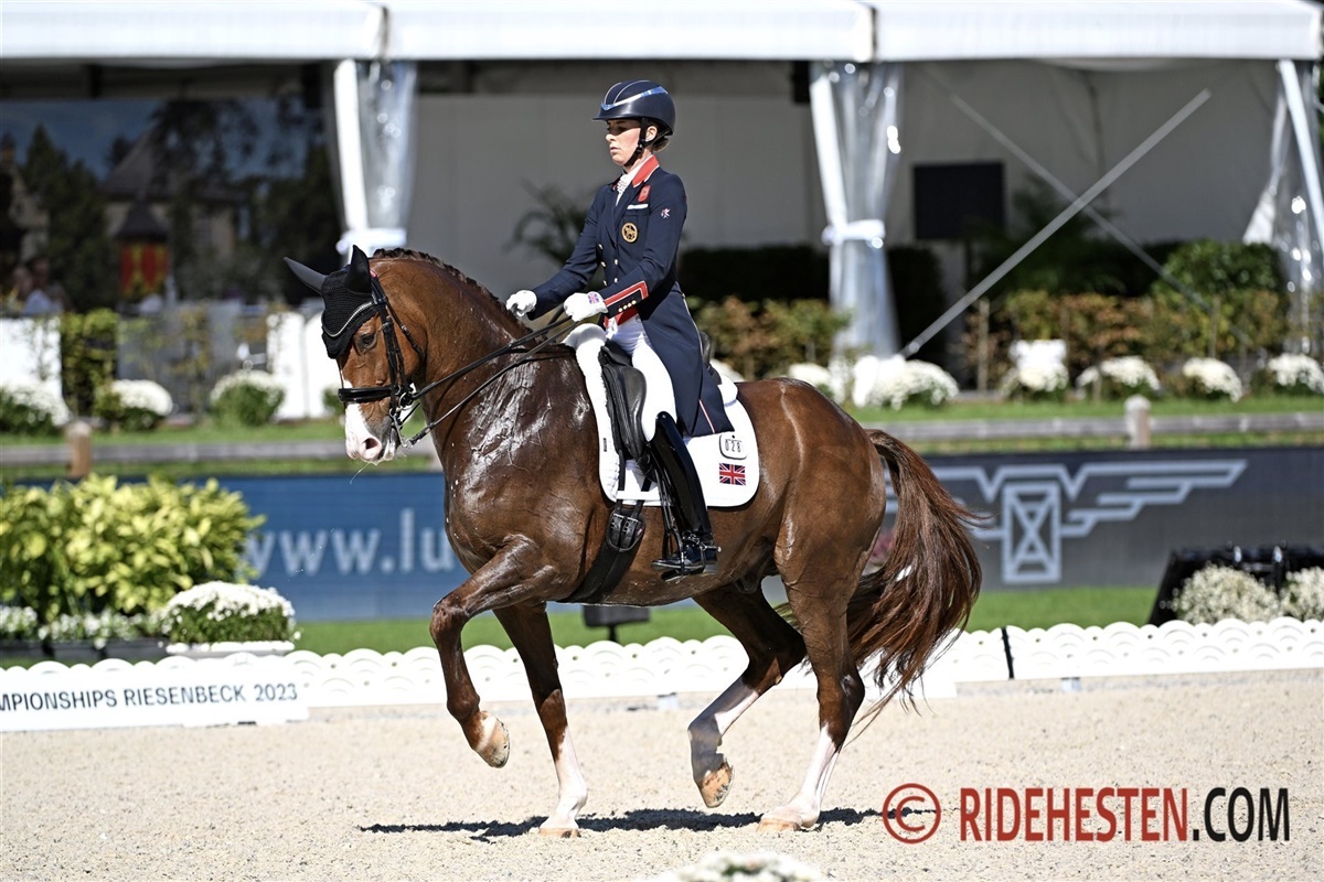 I går red Carl Hester et fremragende program og i dag fulgte Charlotte Dujardin trop. Der er få som kan ride et program så veludført som Dujardin kan, og med 10-årige Imhotep e. Everdale/Vivaldi, var det et ridt lige til lærerbøgerne. Den røde vallak har haft en imponerende udvikling over de sidste år, men også siden Aachen for blot 1,5 måned siden. Piaffe lige på stedet med indundergribende bagben blev fulgt op af galoppirouetter som blev belønnet med 9,2 fra dommerne. Da Dujardin var på vej ud af banen og scoren kom frem med 82,42%, måtte hun tage sig til hovedet for at kunne tro på det. Udover at have lagt sig selv i spidsen af klassen, så har hun også lagt England særdeles i front af holdkonkurrencen.