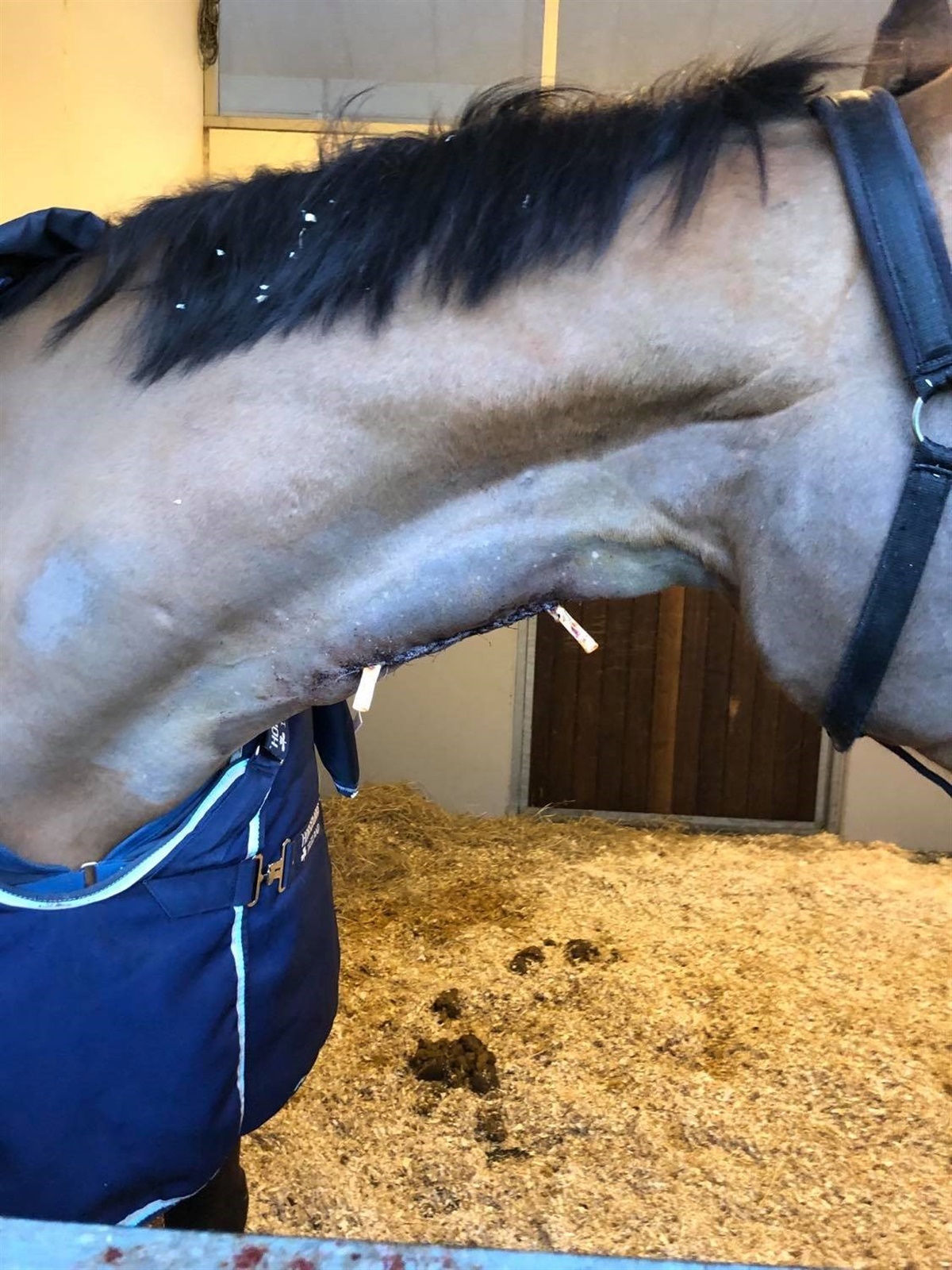 – Han fik et rør i halsen, mens jeg red på ham, for at man kunne se, hvordan det så ud nede i luftrøret, når han bevægede sig. Alt så normalt ud, indtil dyrlægen kiggede helt lige på halsen. Her viste det sig, at hans hals var helt skæv, forklarer Caroline og fortsætter:
