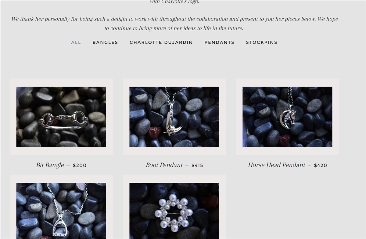 Charlotte Dujardin har lavet to unikke designs i samarbejde med Ray Burmester Equestrian Jewllery. Hun har taget nogle af de eksisterende smykker, som hun elsker og her tilføjet sten efter hendes eget valg og lavet små ændringer. Charlotte Dujardin udtaler, at det er en kollektion, som hun er stolt af at blive forbundet med.