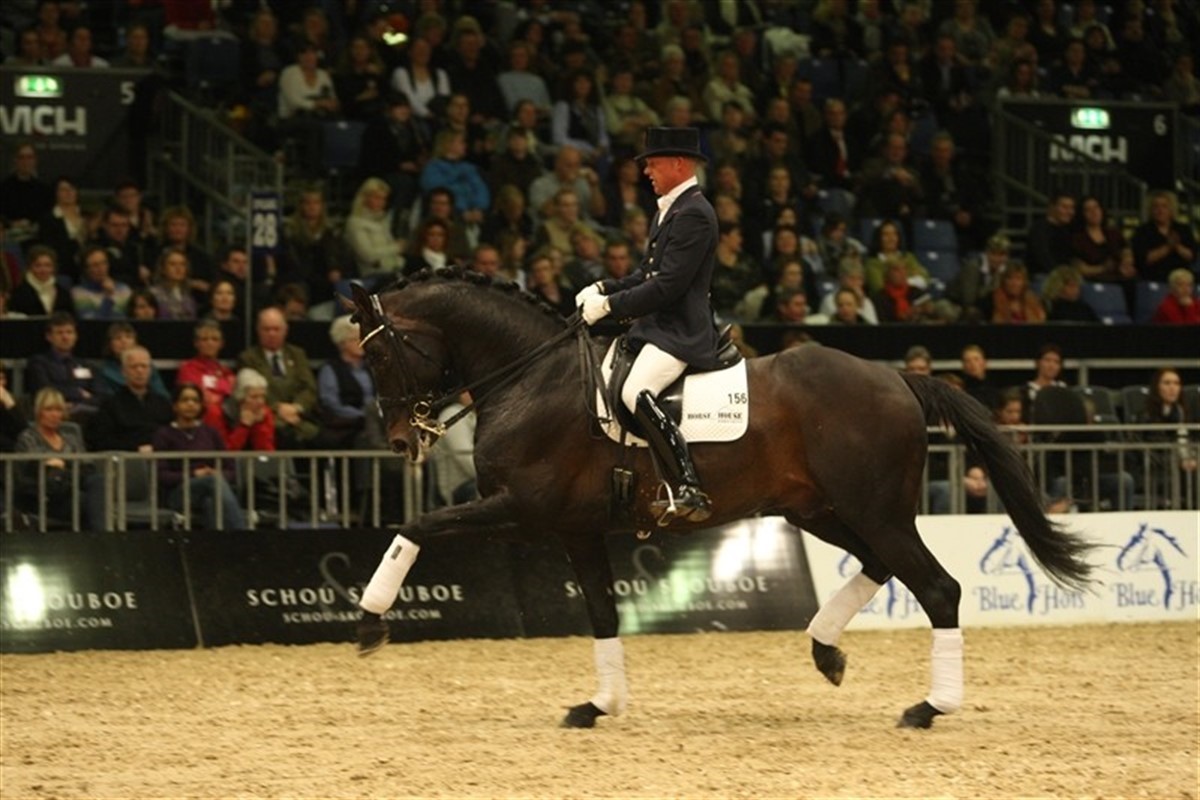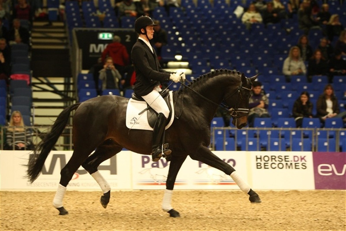 "Jeg vil danse" lød det fra højtaleren, og det gjorde hun så, billedskønne Polka Hit Nexen e. Sandro Hit. Til tonerne af "Pretty Woman" gled hun yndefuldt gennem programmet. Selvom hun sidste år vandt VM-sølv i Verden i kamp mod verdens bedste unge dressurheste, så er det nogle helt anderledes spektakulære rammer at komme ind i for hestene her i MCH Messecenter Herning, så den følsomme hoppe sprang lidt ureglementeret rundt med Dorthe Hoeck i programmet, og det kostede værdifulde point i kampen mod hingstene. I stedet for tog den nye kombination Joachim Thomsen og Samarant e. Sandro Hit kegler på banen, publikum jublede over hingstens charme og flotte bevægelser. I kombination med Joachims flotte opstilling og diskrete indvirkning tog det par teten, for dommerne lod sig også besnære af deres flotte kür og honorerede dem med 75,53%. Blue Hors' nye førsterytter Sune Hansen har haft et travlt program under hingsteshowet i Herning, også i morgenens MB-kür var han travlt optaget med at fremvise hingstestationens populære hingste. På den kun 6-årige Blue Hors Hotline e. Hofrat tog han kampen op mod de ældre og mere rutinerede hingste i klassen, og den opgave bestod parret med glans, dommerne honorerede dem med 72,67% og en andenplads. Susanne Barnow og Onassis e. Obelisk kom ind på tredjepladsen med et flot program, hvor hingsten fik vist sin store ridelighed og dejlige elastiske bevægelser, og det gav en tredjeplads med 70,13%.