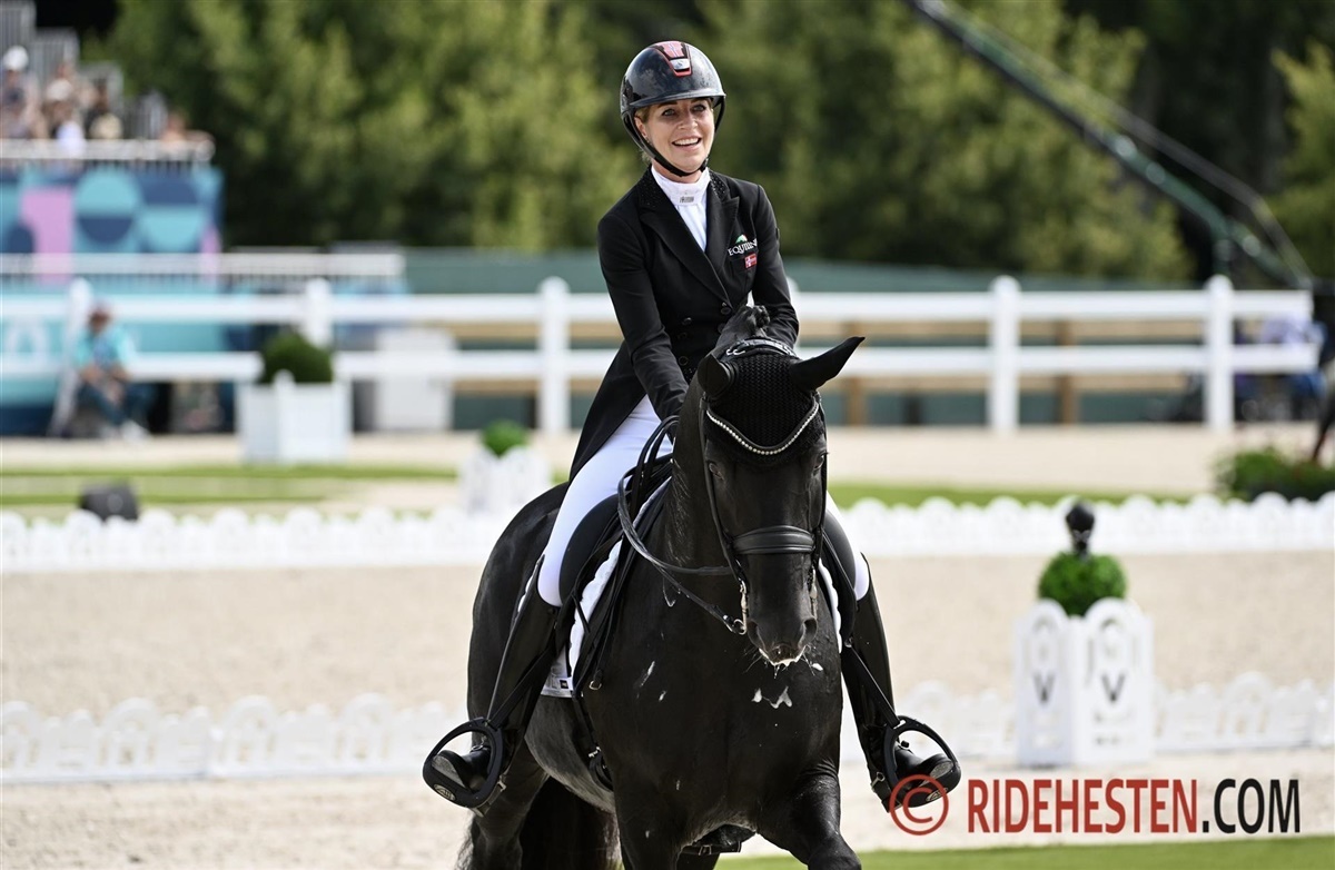 Cathrine Laudrup-Dufour har netop været på banen som sidste rytter for Danmark i sadlen på Mount St John Freestyle e. Fidermark/ Donnerhall II. Free så utrolig velafbalanceret og meget tilpas ud i indridningen, efterfulgt af en virkelig flot første fri trav. Igen viser Cathrine Laudrup-Dufour, hvad harmoni mellem hest og rytter betyder, og ekvipagen er i konstant balance med hinanden. Free står fantastisk flot i fronten hele vejen, og hoppen ser meget veltilpas og rolig ud i arenaen. Virkelig flot overgang fra passage til piaffe og ud i passage igen. Den frie skridt er også meget vellykket hvor Free strækker sig flot frem og ned. Flot overgang fra skridt til passage og igen virkelig flot ind i piaffen.