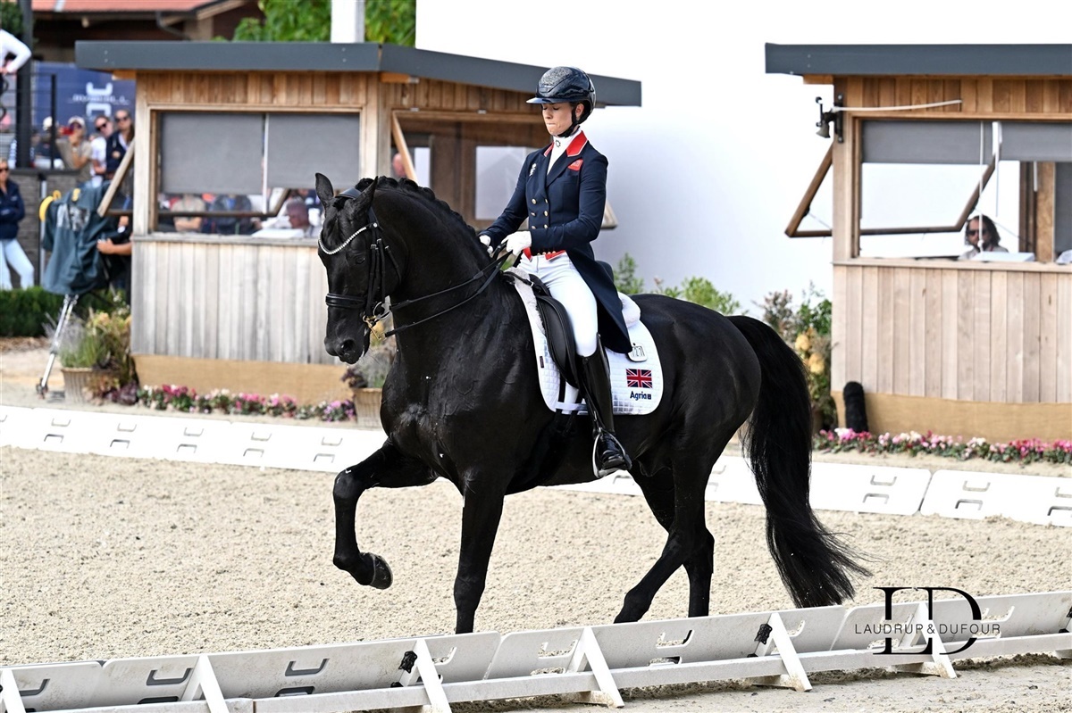 Alle dressurentusiaster husker Charlotte Fry og den imponerende Glamourdale e. FS Lord Leatherdale/ Negro fra VM i Herning i 2022, hvor de vandt individuelt guld. I dag red de på banen som sidste engelske ekvipage, og her viser den imponerende hingst endnu en gang fantastisk form. Flot indridning og vellykket fri trav. En lille smule bag hjælperne i den første piaffe, men strækker sig rigtig flot ned og frem i den frie skridt - man kunne måske ønske en smule mere overtrædning, men hingsten spænder af og klarer sig godt igennem skridtprogrammet.