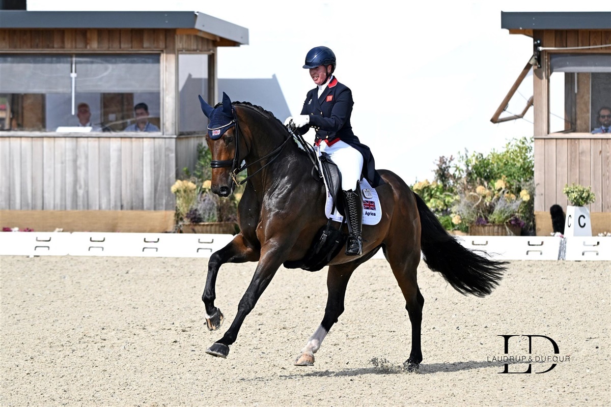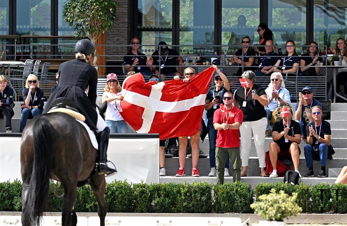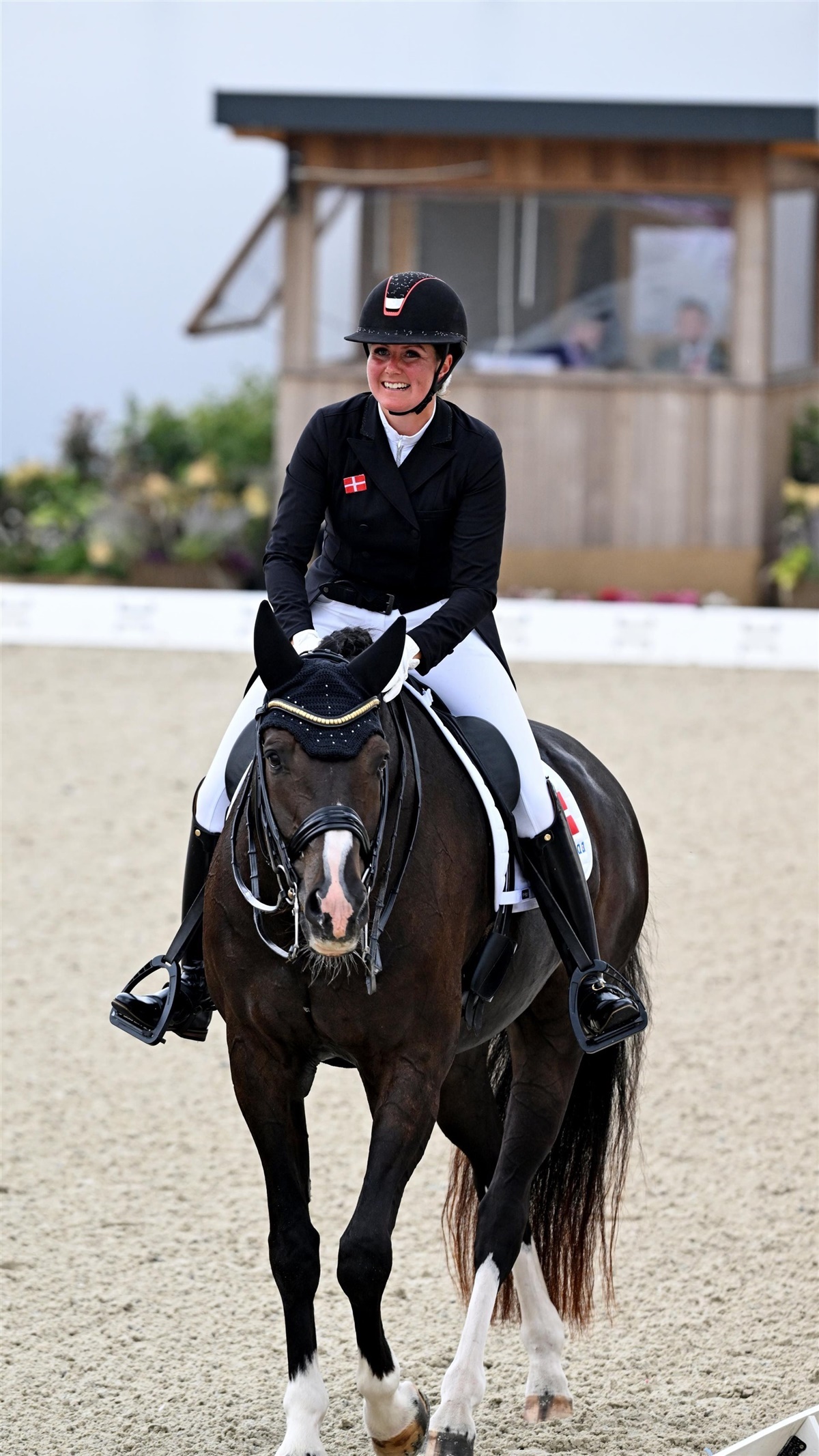 Anden danske ekvipage på banen i dag var 54-årige Rikke Dupont og Grand Galiano e. Grand Galaxy Win/ Blue Hors Don Schufro (opdr. Lotte og Gert Buchhave). Rikke og den 10-årige DV-vallak indfriede ved sommerens CHIO i Aachen for alvor deres potentiale, som er i tråd med den udvikling, der har været, siden de i 2022 blev en del af DRF’s perspektivgruppe. På baggrund af Aachen-resultaterne blev Rikke en del af A-gruppen og for første gang udtaget til at repræsentere Danmark ved et stort, internationalt mesterskabsstævne.