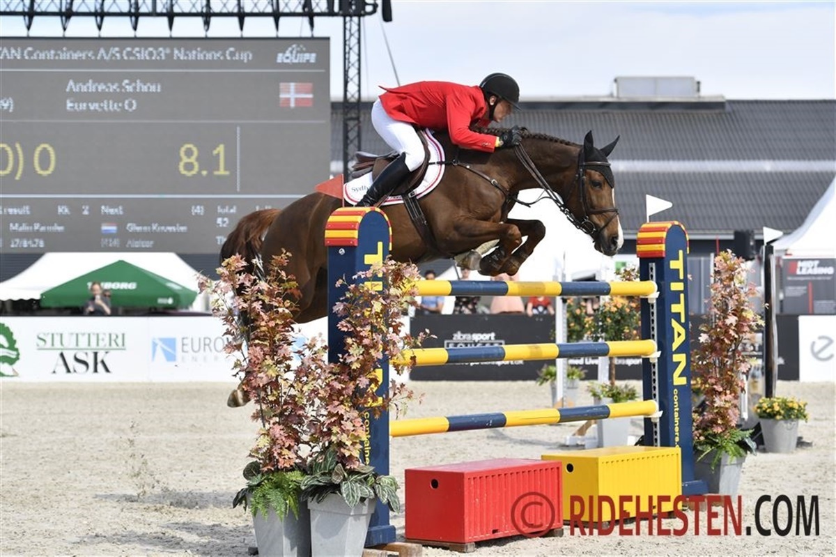 Første rytter for Danmark, Andreas Schou og Euvette var fejlfrie lige indtil den problematiske linje, hvor de fik to nedslag. Da konkurrenterne også fik flere fejl på banen, var optimismen dog i behold i den danske lejr. Martin Dinesen Neergaard og Contador viste, i lighed med Andreas og Euvette stort overskud på forhindringerne, men også for Martin udløste deres ridt fejl, idet der opstod en misforståelse mellem hest og rytter på den anden forhindring, hvilket kostede et stop. Det betød at Martin var presset af tiden, og derfor måtte satse lidt, og han fik et nedslag på trekombinationen og tidsfejl, hvilket gav ham ialt 11 fejl.