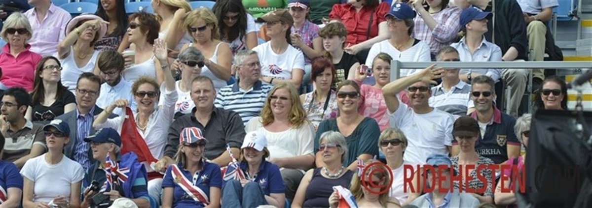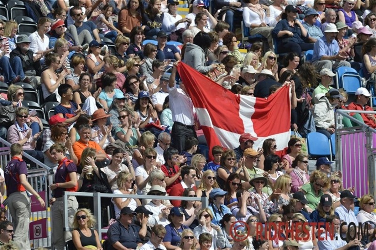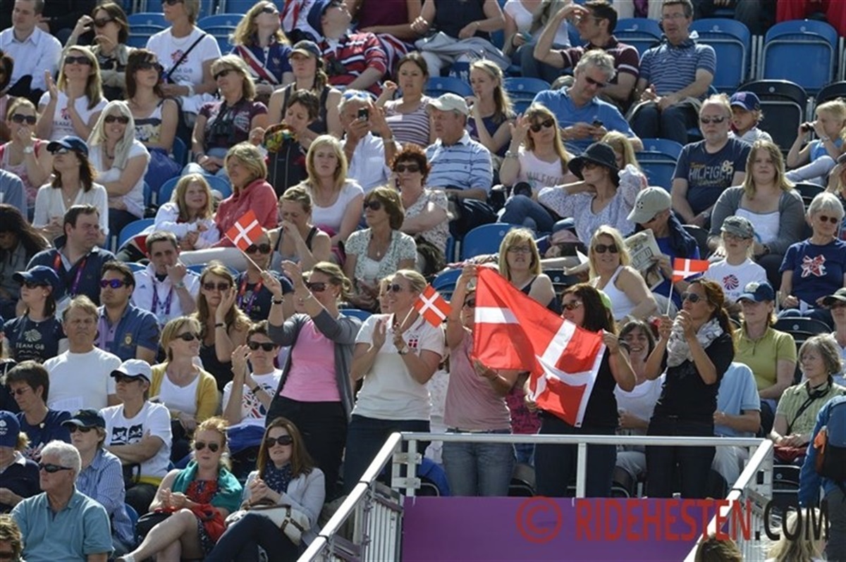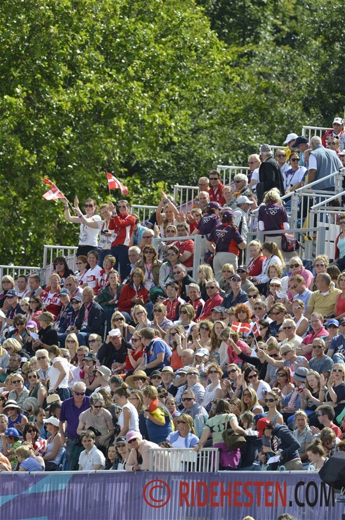 Flere danske avlere og ryttere har fået billetter til OL og flere af dem har medbragt flag og de jubler så det kan høres på stadion, når danskerne har været i ilden. Det engelske publikum er ellers lidt påholdende, når det gælder om at vise deres begejstring for ryttere fra andre nationer end deres egen, til gengæld så er jublen desto større, når det er en brittisk rytter, der er i ilden.