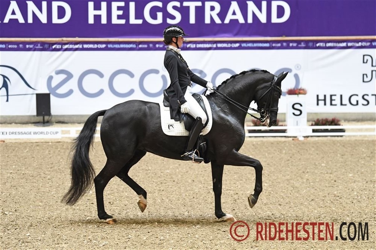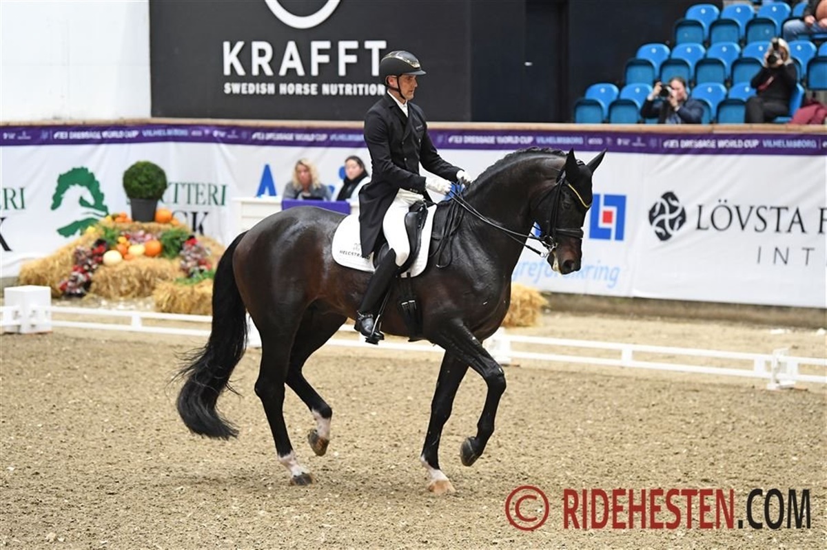 Også Andreas Helgstrand debuterede en hest i World Cup-sammenhæng, nemlig den ekstravagante avlshingst Jovian e. Apache/ Tango. Den kun 8-årige hingst har en vanvittig stor og flot trav, som kommer den til gode i den frie trav, men også en imponerende skulderfrihed og rækkevidde, som man virkelig fik at se i sidetraversaderne. Den kæmpestore trav giver måske lidt problemer i de mere samlede øvelser, hvor hingsten i hvert fald i dag ikke helt lod til at fange takten og rytmen i piaffe. Men med så meget kvalitet og kapacitet i både gangarter og udførsel af øvelserne blev det til tonerne af Ed Sheeran forståeligt nok til hele 80,000% i debuten og en fjerdeplads.