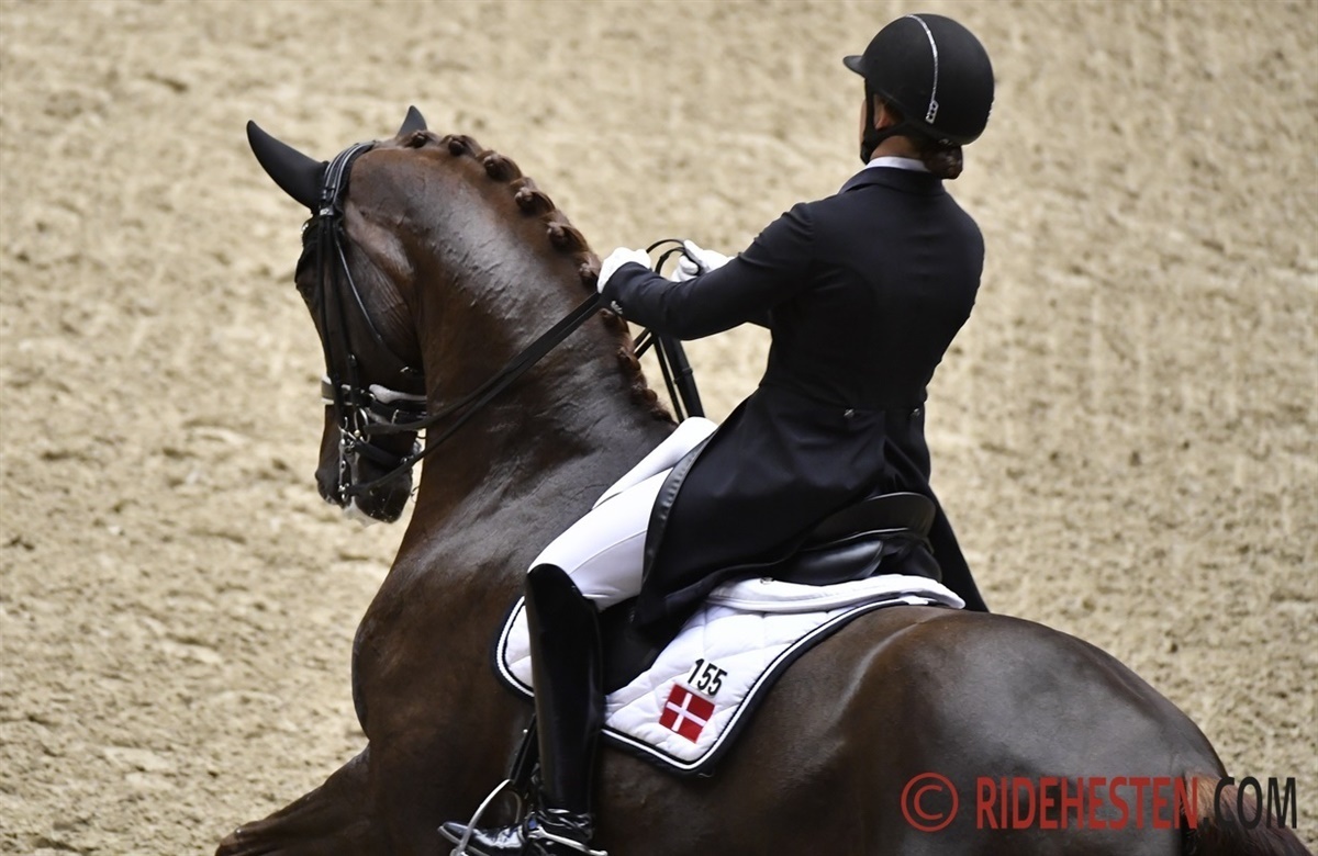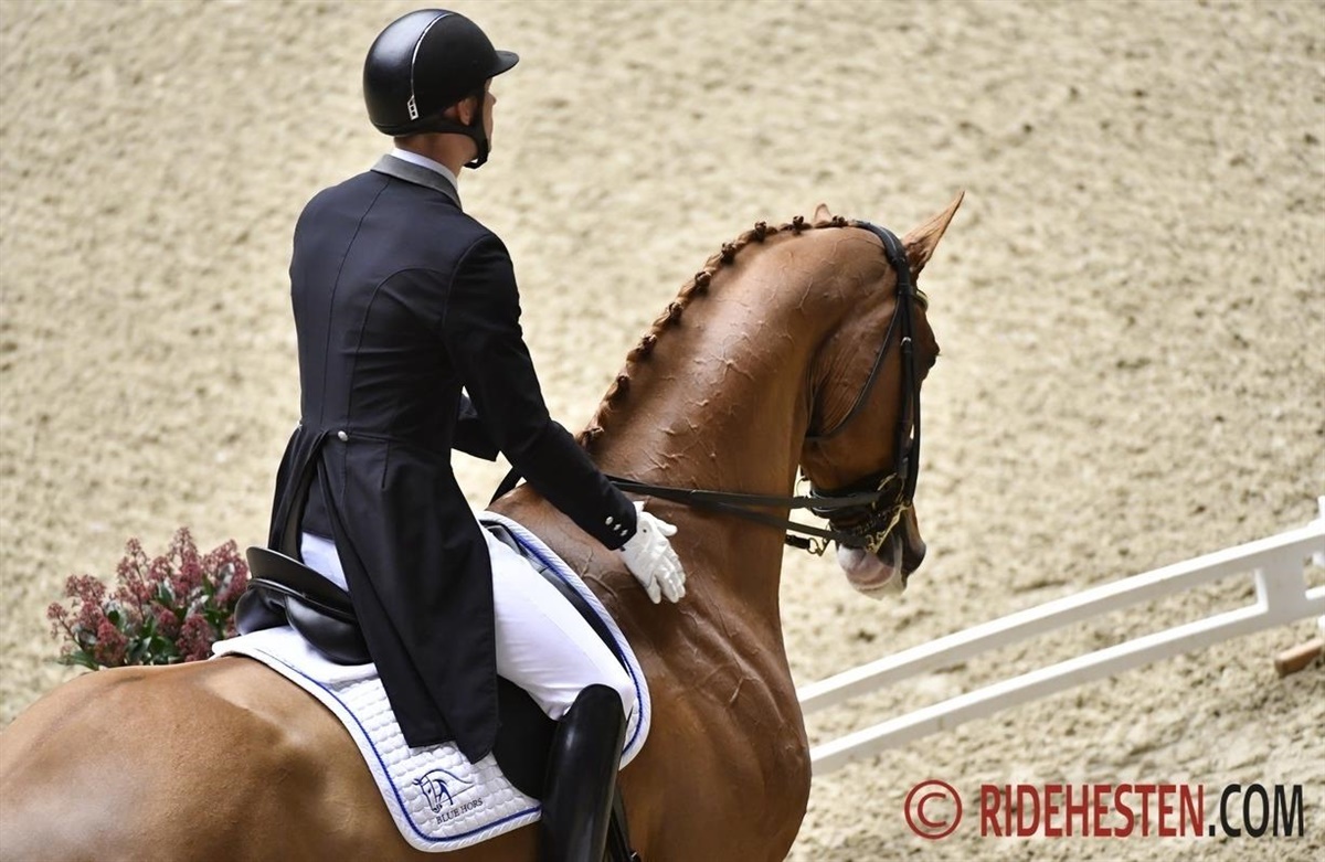 Daniel Bachmann Andersen og den 10-årige oldenburgervallak Blue Hors Zepter e. Blue Hors Zack / Wolkentanz II scorede imponerende 76,826% for et fejlfrit ridt, hvor de fik vist masser af flotte overgange og ikke mindst Zepters store gangarter med sving og bæring ud af og ind i de korrekte udførte øvelser. Det er tydeligt at se, at den knap 180 cm høje Zepter i sin stævnepause har tilegnet sig mere styrke og dermed endnu mere øvelsessikkerhed. I dag besatte ekvipagen en flot andenplads i et stærkt felt. Læs her Daniels udtalelser om sit ridt.