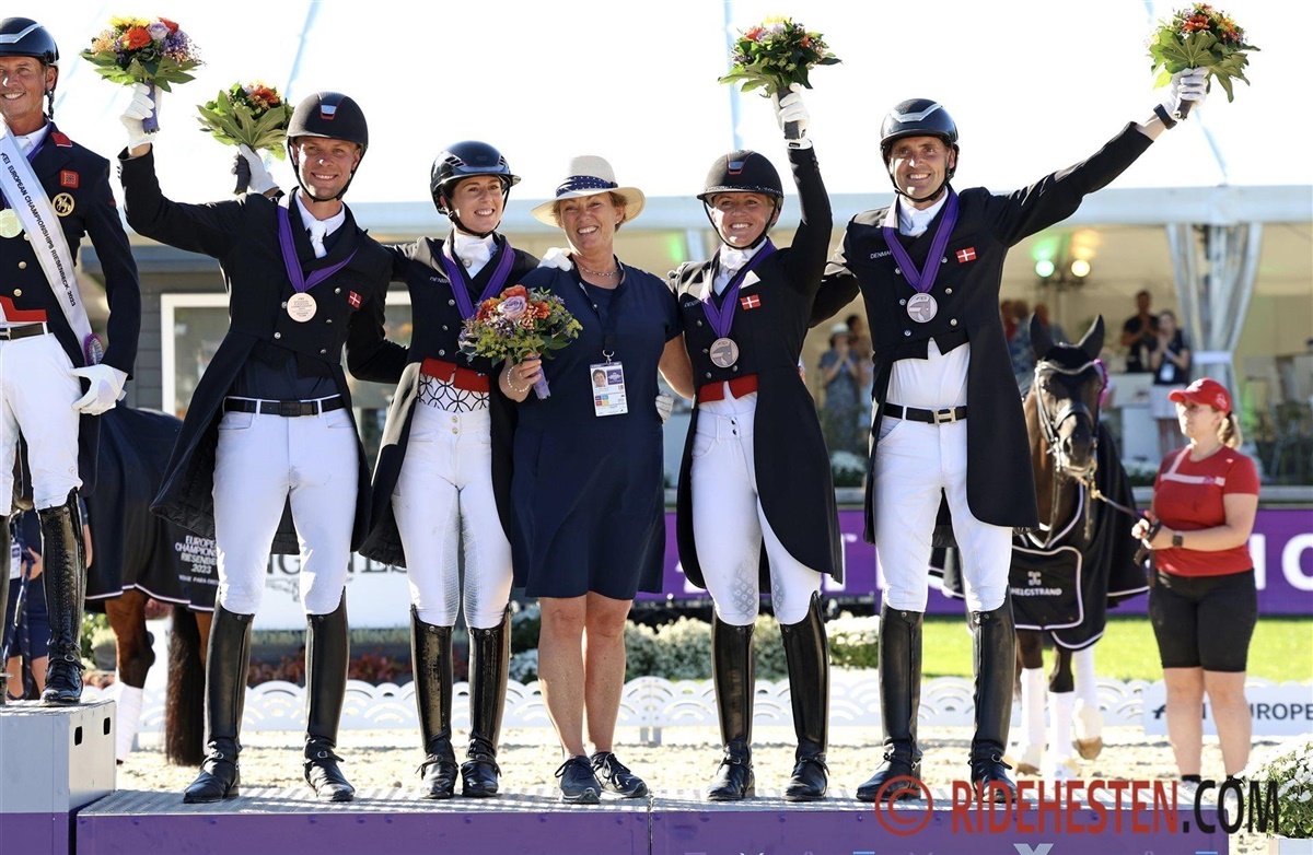 For danskernes vedkommende blev det en gentagelse af EM i Hagen i 2021, hvor Danmark vandt EM-bronze. Tre af rytterne var også med på holdet dengang, men i år bestod holdet af Andreas Helgstrand med Jovian, Carina Cassøe Krüth med Heiline’s Danciera, Daniel Bachmann Andersen med Vayron samt Nanna Skodborg Merrald med Blue Hors Zepter.