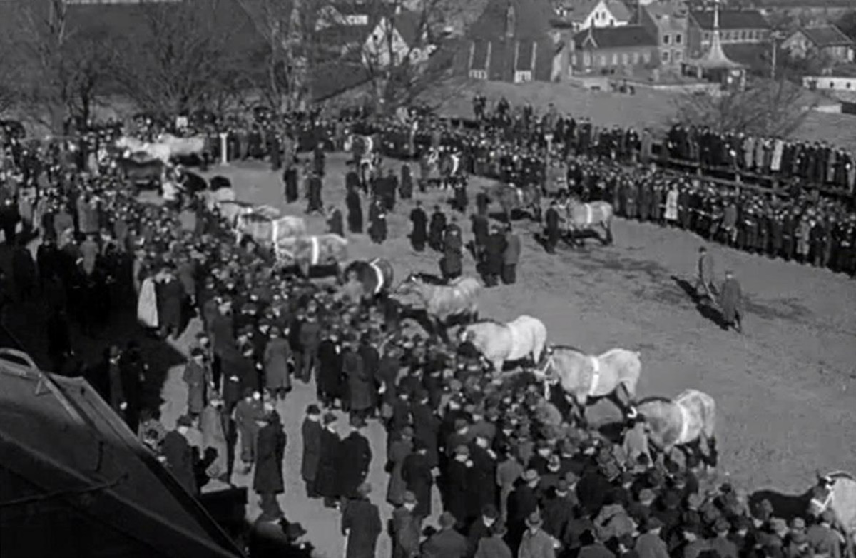 Vi viser her et klip fra hingstekåringen den 26. februar 1943, hvor omkring 5.000 landmænd var samlet for at beundre de flotte dyr - ikke mindst Danmarks dyreste hingst, belgieren "Mussolini", der havde kostet 80.000 kr.