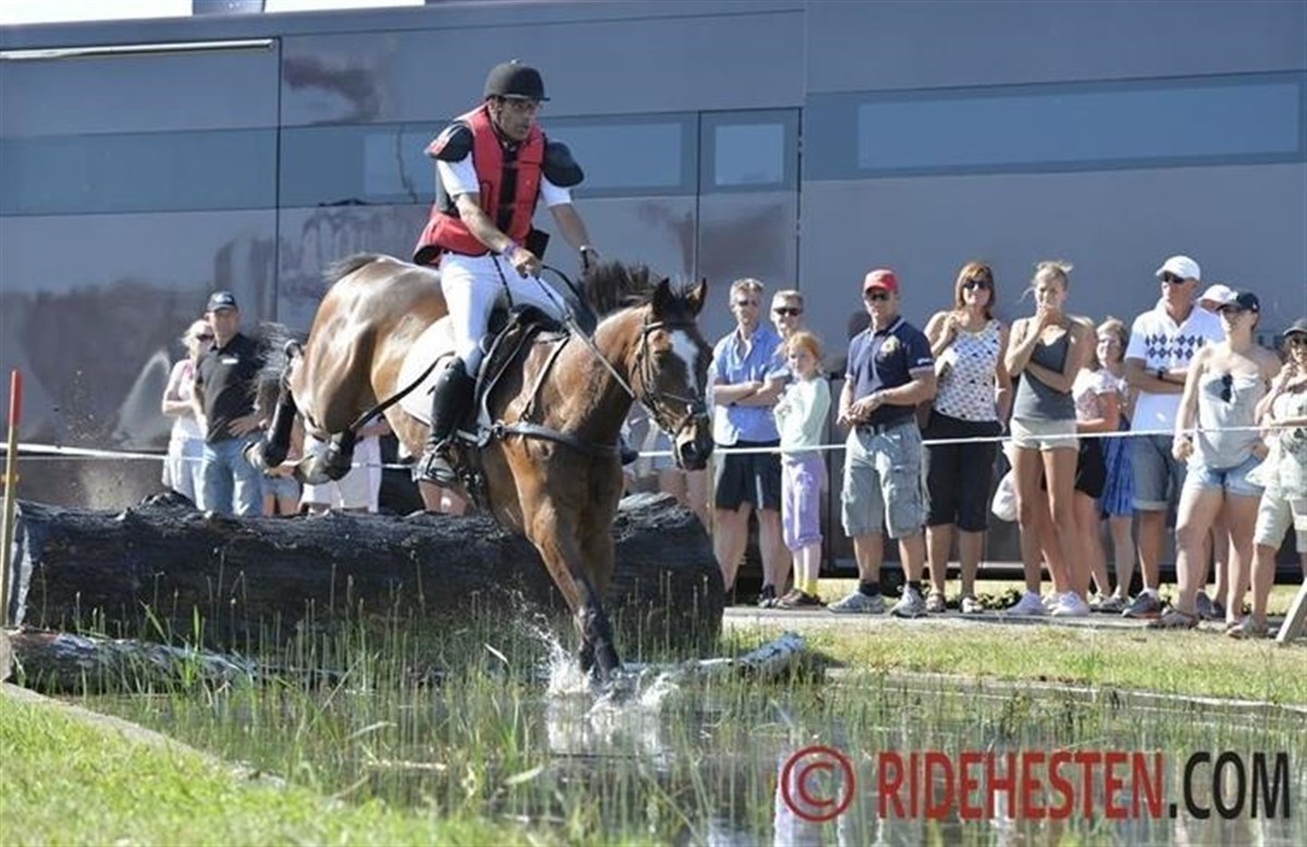 Stemningen var i top da 15 ryttere mødtes i terrænspringningen Falsterbo Hunting her til eftermiddag. Rundt om på stævnepladsen er der faste forhindringer som rytterne skal overvinde, og blandt dem også et vandspring, som traditionen tro tiltrækker mange tilskuere og fotografer. Vi blev dog ikke vidne til en vandgang i dag, men et enkelt stop blev det til i vandkomplekset.