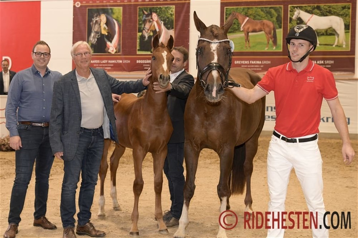 Anne Lyngbye er en af auktionens tilbagevendende kunder, og hun trak også det længste strå, da det meget velgående hoppeføl Vendetta CL e. Vitalis/ Sezuan (opdr. Cecilie Lyndrup) kom under hammeren og fik online bud fra Holland og ligeledes mange bud salen. Det dejlige hoppeføl, som var blandt eftermiddagens finalister om titlen som årets bedste, blev erhvervet for 38.000 EUR (ca. 282.000 DKK).