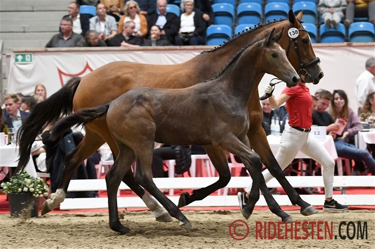I anden halvdel af auktionen kom hoppeføllet Slangerups Josefine e. Jovian/ Scolari (opdr. Slangerupgaard A/S) i arenaen sammen med sin mor, der også er mor til den kårede hingst Flottenheimer. Der var bud fra alle sider på det dejlige hoppeføl, der fik flere online bud fra bl.a. Holland, men også adskillige bud fra salen. Det blev Helgstrand Dressage, som ejer faderen, den nykårede verdensmester for 7-årige dressurheste. Hammeren faldt på 72.000 EUR (ca. 535.000 DKK).