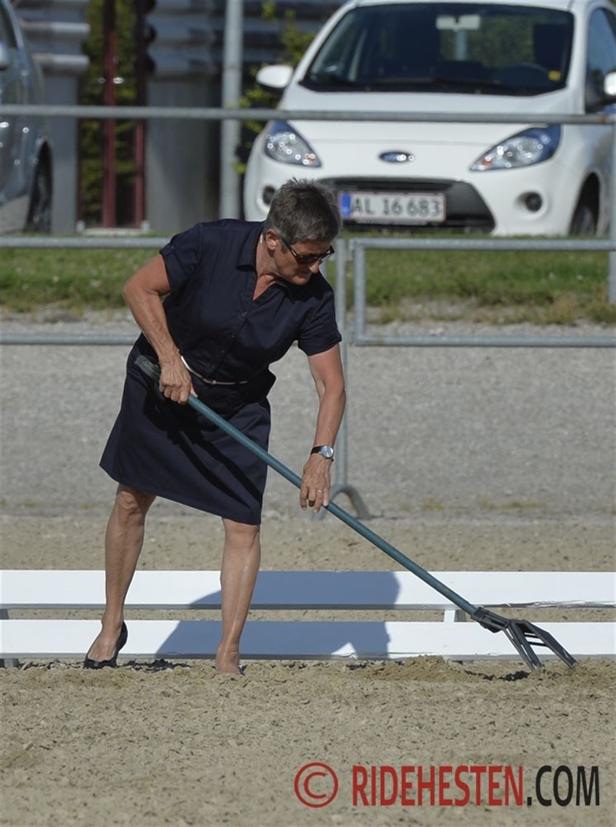 Dressurdommer Birthe Lyder Nielsen var vaks til at svinge greben og udjævne nogle huller foran dommertårnet.