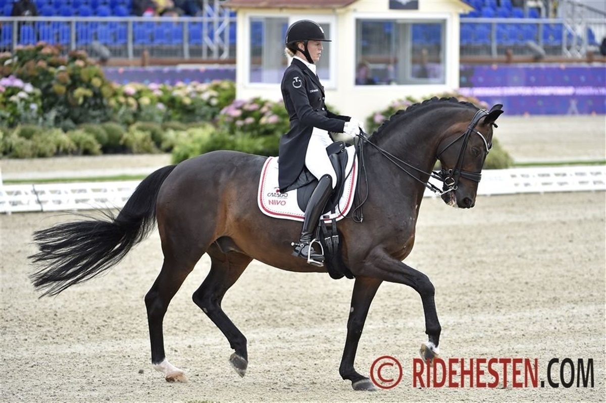 Seniorernes holdkonkurrence er som vaneligt delt op over to dage og efter dagens 35 ryttere, er vi nu halvvejs gennem konkurrencen som afgøres i morgen. Som man kan læse om HER, havde dagens to danskere, Charlotte Heering og Nanna Skodborg Merrald, to gode ture hvor Nanna med Atterupgaards Orthilia e. Gribaldi/ Donnerschlag (opdr. Atterupgaard) endte som klassens nummer to med imponerende 75,07%.