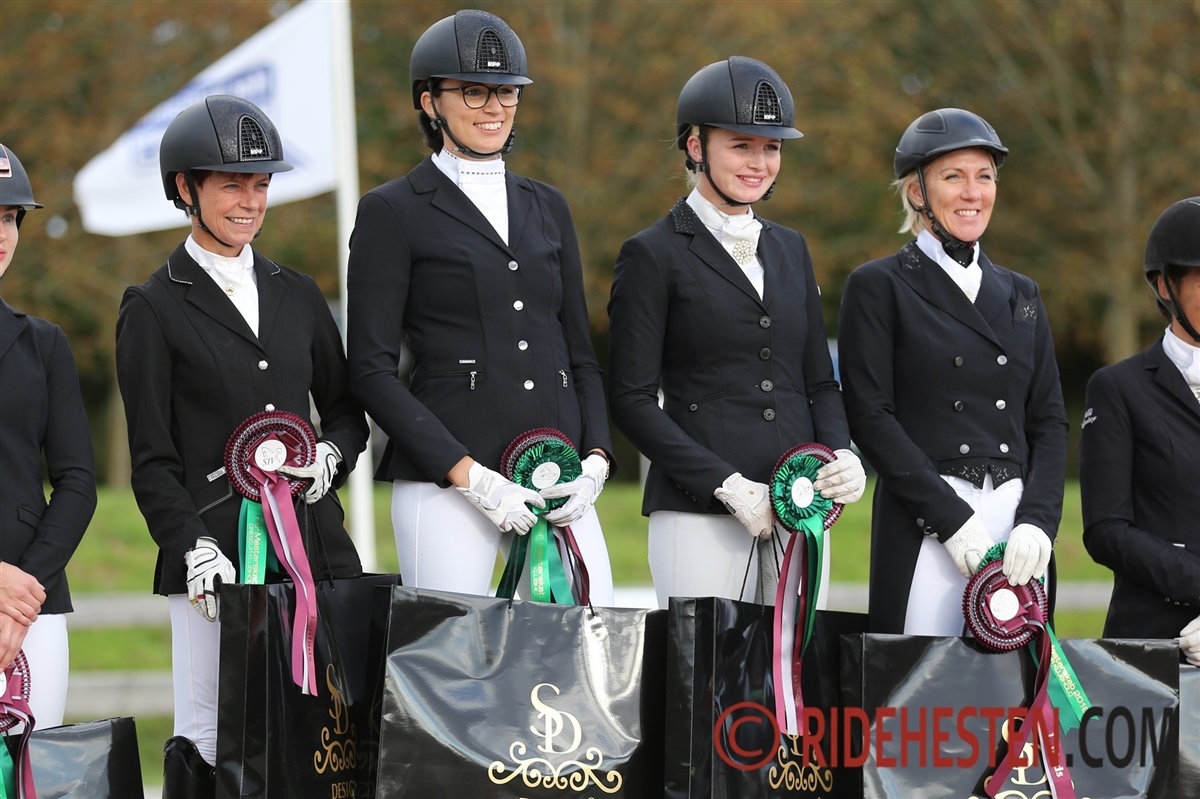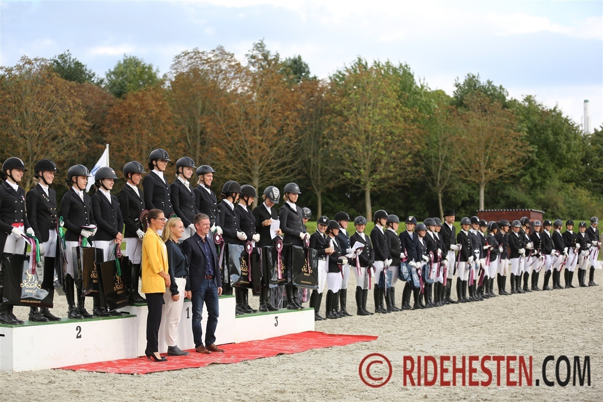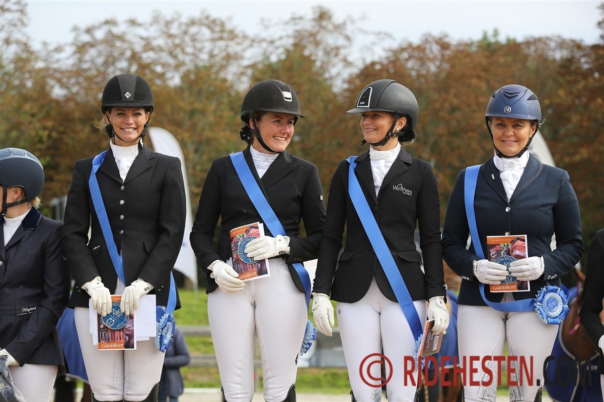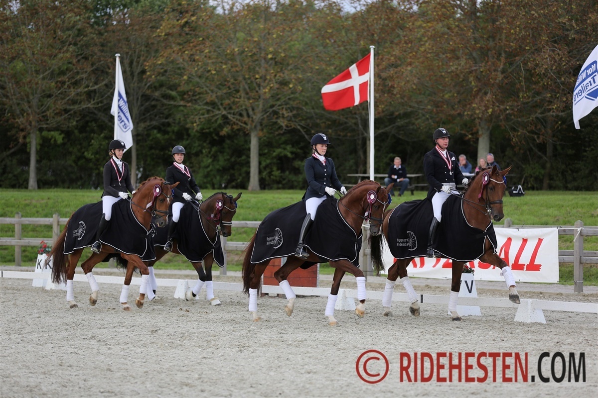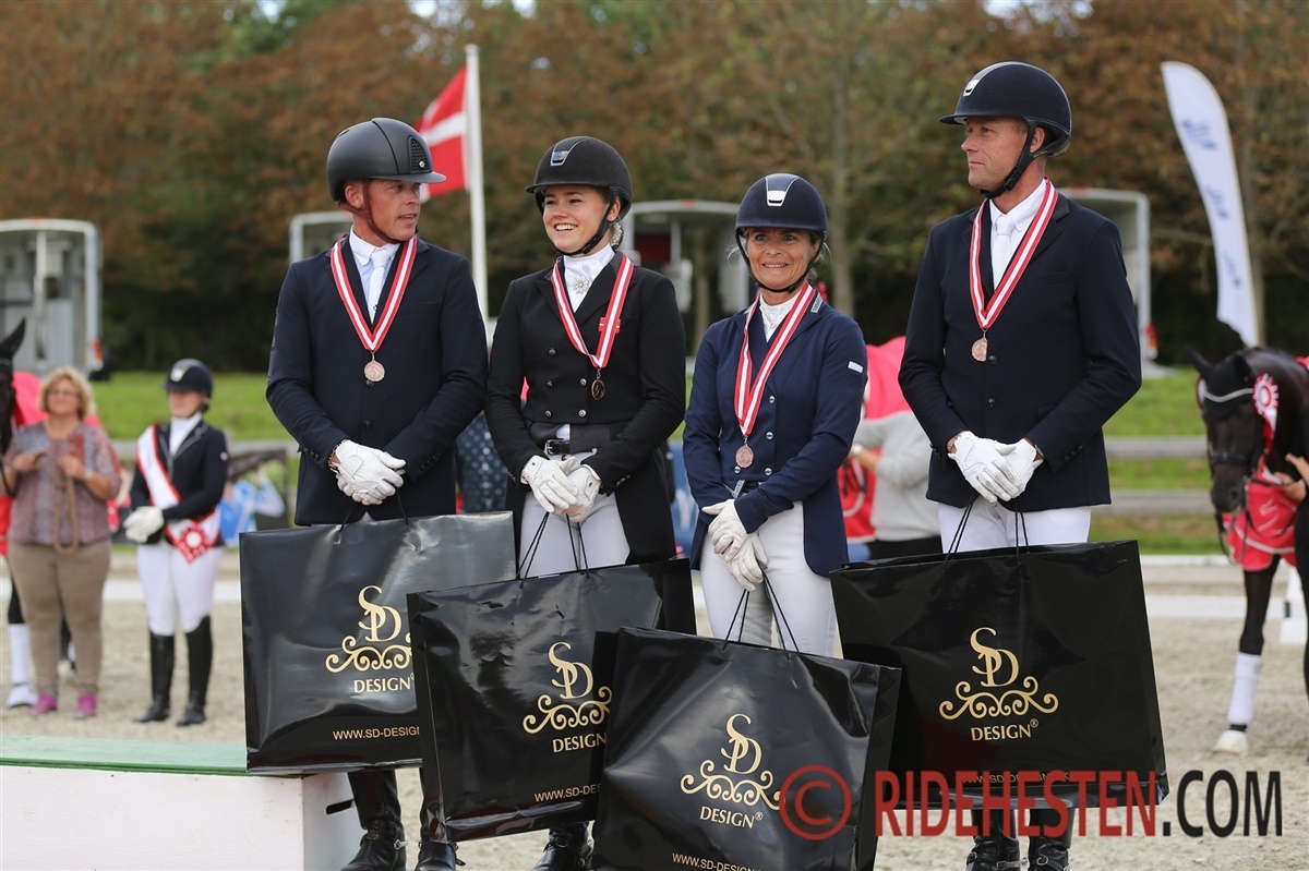 I går lå holdet fra Vallø Sportsrideklub nr. 4, men i dag fik de netop sneget sig op på podiet og med 423,579 % blev bronzemedaljerne overrakt til Olivia Lamm med San Dior (PSG), Rune Willum Hansen med Atterupgaards Seebach (MB2), Joachim Chr. Thomsen med Dam’s Duchess (MB1) og Anne Troensegaard med Neikos (LA5). Holdet blev efterfulgt af to hold fra Ertebjerggaard Sports Rideklub (med 423,212 % og 422,065 %) og Aarhus Rideklubs hold bestående af fire af klubbens beriderelever (411,225 %).