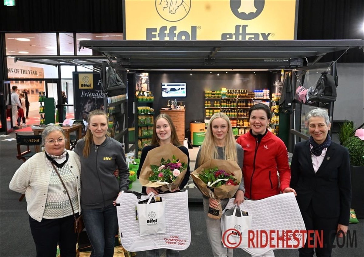Ung i DV har som noget nyt ingen stand i år, men de har et samarbejde med Effol/Effax, hvis stand er at finde i Hal M i MCH Messecenter Herning. Årets præmieoverrækkelse i DM i Hest vil i dag kl. 14.00 foregå her, og det var også her, at de to piger under klapsalver fredag fik overrakt blomster, vinderunderlag og Effol-plejeprodukter.