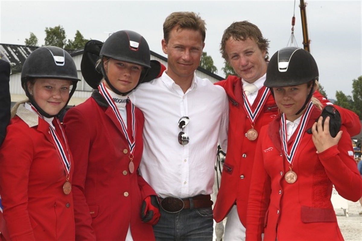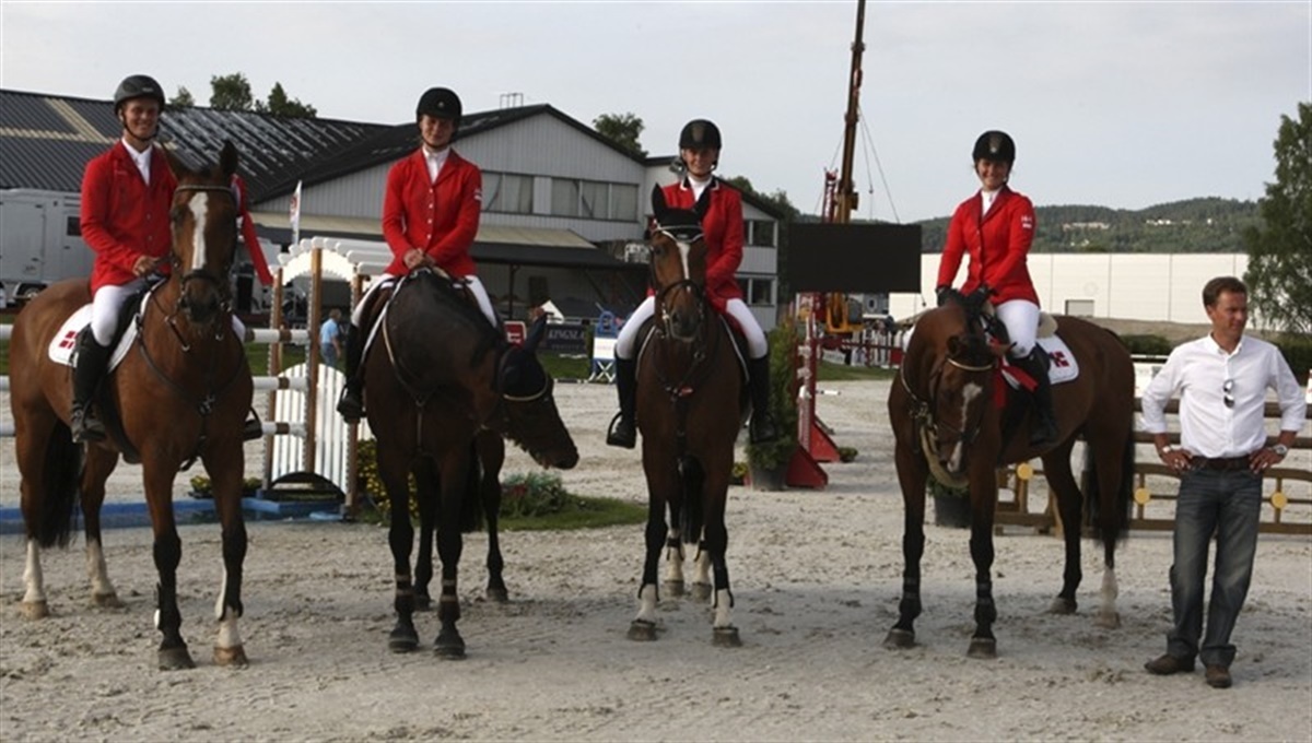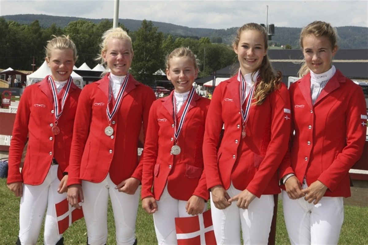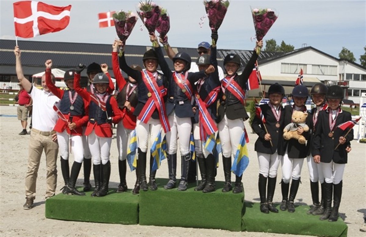 Svenskerne var desværre bare bedst i dag i holdkonkurrencerne i springning, og alle tre gange sluttede de øverst på sejrsskamlen. I morgen er vores sidste håb, når kat. I ponyerne skal ride deres holdkonkurrence. Først var det de svenske kategori II ponyer der vandt deres holdmesterskab med ene fejlfrie ridt, men det danske landshold sluttede på en fornem andenplads med samlet otte fejl. Hermed kunne danskerne få overrakt sølvet. Holdet bestod af: Caroline Bundgaard/Hello Happiness, Freja Sidal Mortensen/Coleen, Laura Holck/Seapatrick Total Eclipse og Simone Bardrum/Louis Walsh For juniorerne tog de kære nordmænd sølvet og Danmark måtte nøjes med en fin bronzemedalje. Her sluttede Sverige med 4 fejl, Norge med 8 og Danmark med 16 fejl. De danske juniorer var Mie Daugaard Reimer/Rosina Mosebo, Rikke Belinda Barker/Cora, Shannon Meinert Ketterle/Otto 34 og Kasper H. Hansen/Cantango Lyngriis. For ungrytterne var der anderledes spænding til det sidste, da Danmark og denne gang Finland måtte ud i en nervepirrende omspringning om sølv- og bronzemedaljerne, da begge hold stod med 16 fejlpoints efter anden runde. Her viste de unge danskere at de altså formår at holde nerverne i ro til det allersidste. Først var det Rikke Andersen på Lacosta og Camilla Ernst på Monique der hver leverede en fejlfri runde. Derefter fik Emil Tvermose og Senator fire ærgerlige fejlpoints, men Emil er helt tilgivet eftersom han, som den eneste på holdet red fejlfrit i både første og anden runde. I mellemtiden havde en finsk rytter lavet 8 fejl og en anden 4 fejl, hermed kunne Josephine Toftdal Bagge på Leonhardt ride sølvet sikkert i hus med en flot fejlfri omspringning. Altså sølv til Danmark og Bronze til Finland.