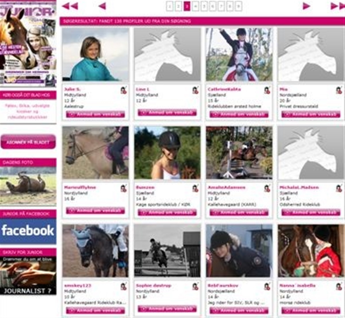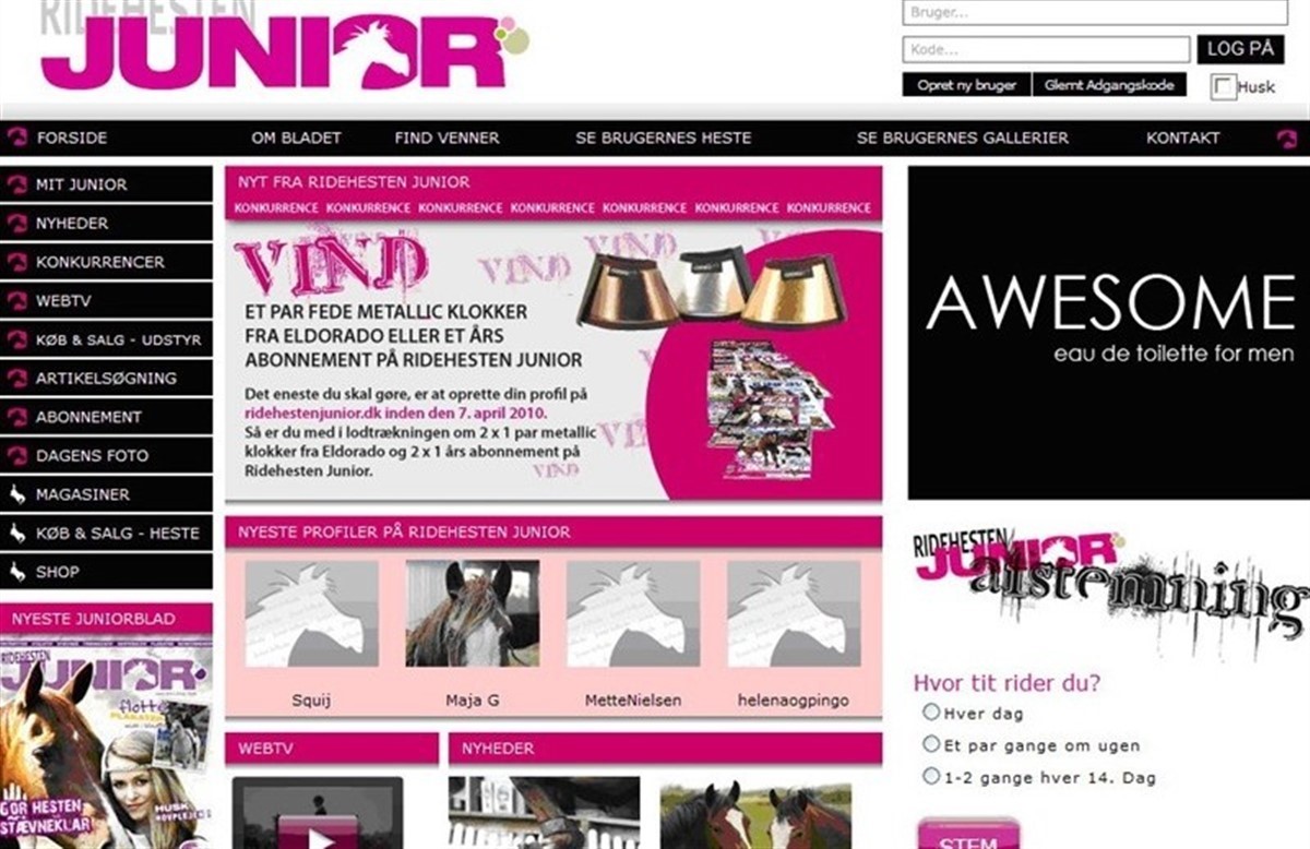 Mere end 140 brugere har allerede oprettet profil på JUNIORs nye hjemmeside - her kan man fortælle om sig selv og sin hest samt vise billeder af sin allerbedste 4-benede kammerat. Man kan også få venner og skrive til dem, hvad man laver - og ikke mindst fotælle om resultater og oplevelser med sin pony eller hest. Alle børn og unge, der opretter profil inden 7. april deltager i konkurrencen om 2 x 1 sæt seje metallic klokker fra Eldorado og 2 x 1 årsabonnement på JUNIOR. Hvis du ikke allerede har gjort det, så tjek den nye hjemmeside ud via linket.