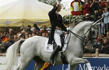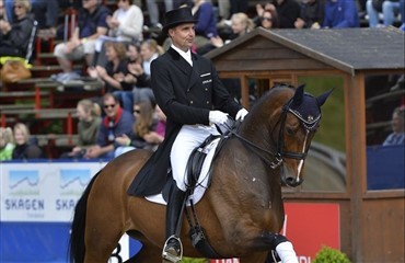 Blue Hors Romanov og Andreas Helgstrand har været helt suveræne i dressurklasserne ved hingstekåringen i Herning. Ekvipagen har vundet alt, hvad de har startet. I dag blev det til sejr til i Grand Prix i parrets debut i denne klasse. På trods af lidt småfejl og en naturlig mangel på styrke opnåede de alligevel så flotte karakterer som 72,67%. Det skal blive en fornøjelse, at se hvad Blue Hors Romanov e. Rohdiamant udvikler sig til. Det er virkelig en verdenshest i svøb. I Grand Prix klassen, som var sponseret af ECCO, blev kom Anke Ter Beek og trakenerhingsten Kaiser Wilhelm e. Lehndorff’s fra stutteåri York på andenpladsen og Finn Kryhlmann Hansen og Lergaardens Leandri e. Leandro blev nr. tre.