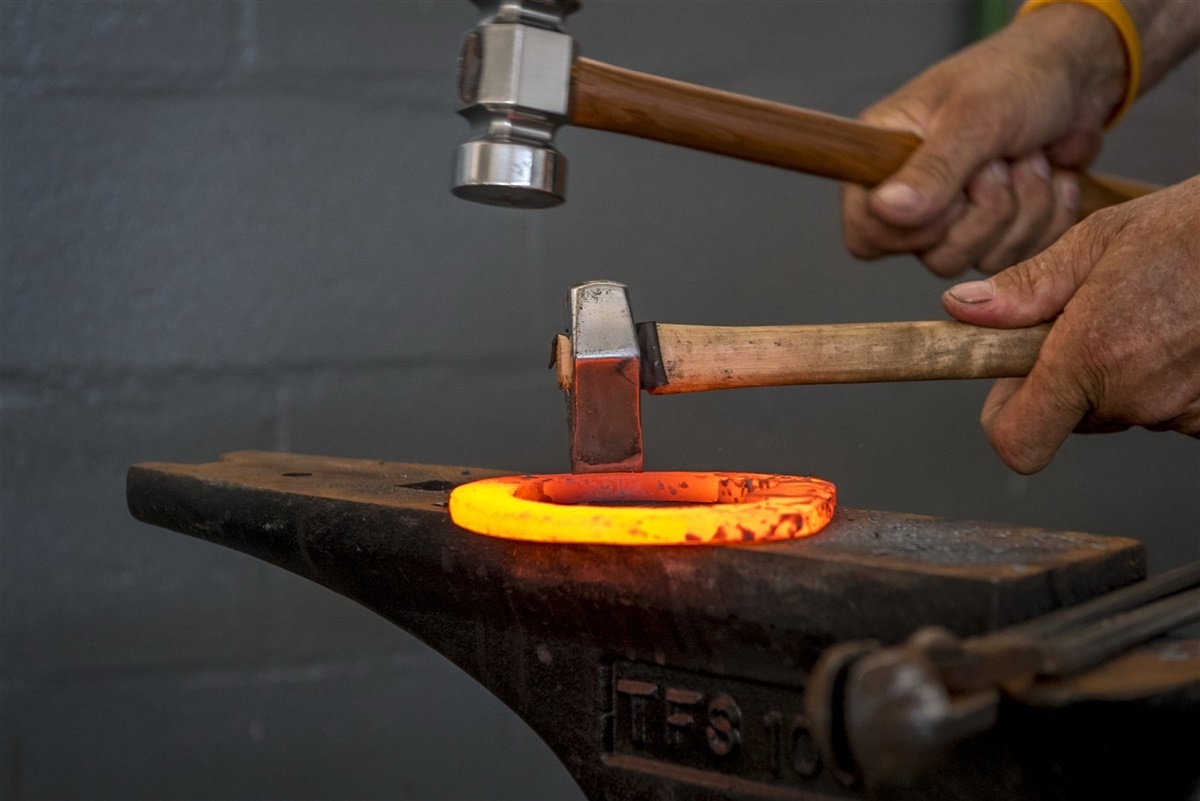 For at opnå den ultimative heste pasform, opvarmes skoen til 800 rødglødende grader, før den bliver smedet på ambolten til den korrekte form. Når skoens temperatur er faldet, presses den mod hoven for den optimale pasform. Skoen afkøles til arbejdstemperatur i vand, og så bliver de slået fast, nogle med kobbersøm som virker antibakteriel, så følger en pedicure, og så er hestene klar til jobbet.